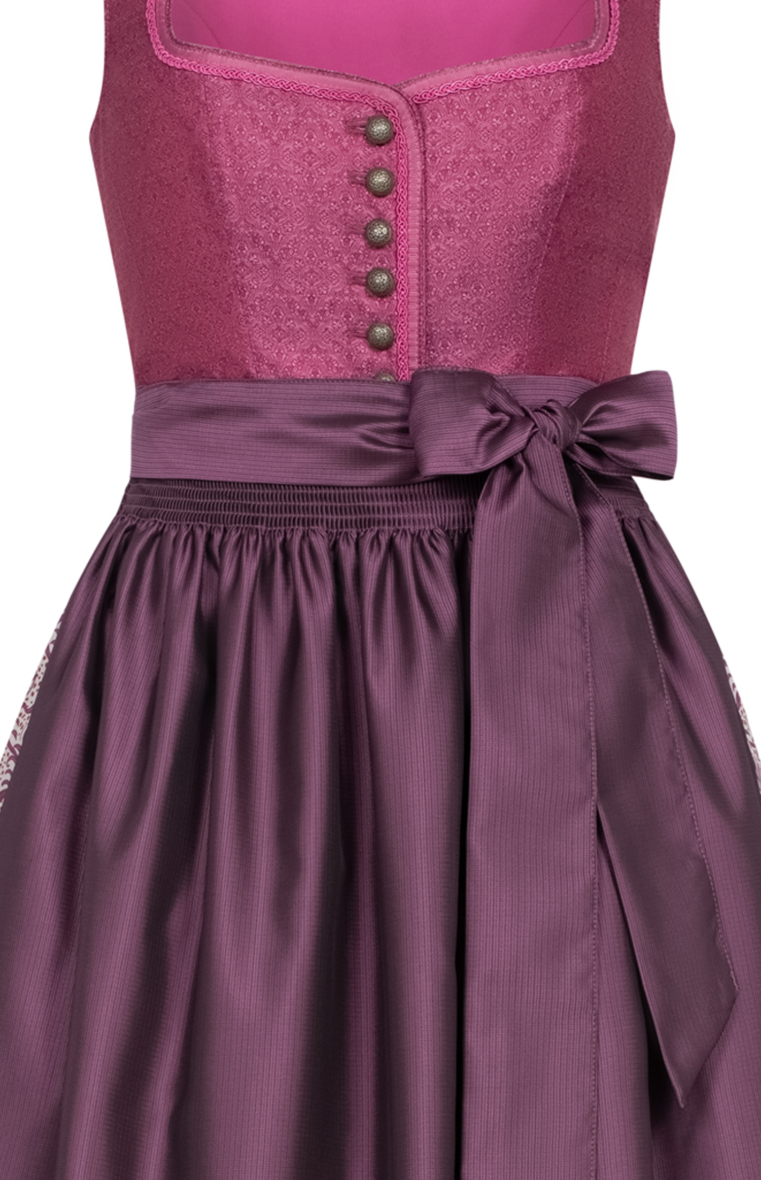 Dirndl Lang Gerit in Beere von Nübler – ein Dirndl für starke Auftritte. Das Mieder zeigt ein feines Strukturmuster und formt durch den klaren, leicht gerundeten Ausschnitt ein elegant betontes Dekolleté. Die Knopfleiste im Altsilberlook setzt einen hochwertigen, traditionellen Akzent.