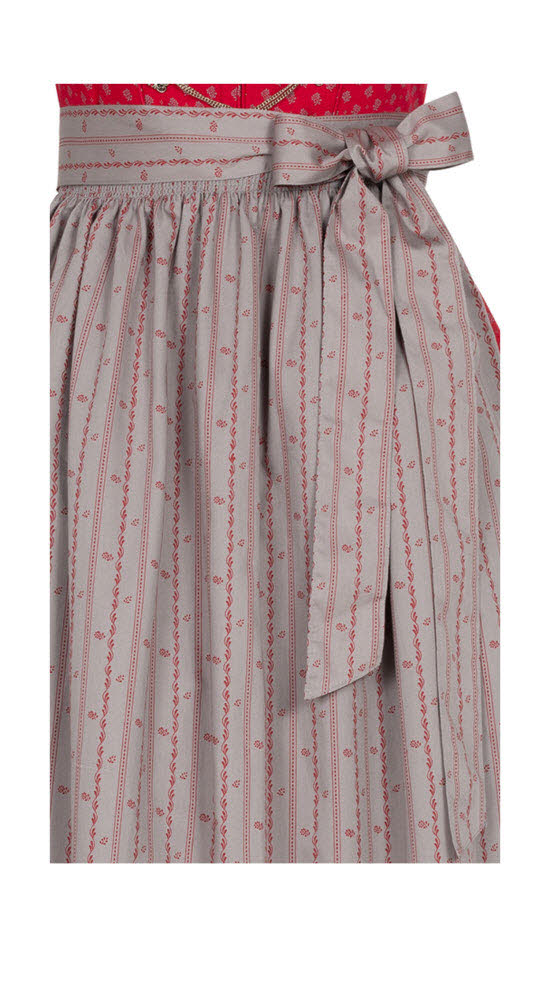 Der Dirndlrock verfügt über eine seitliche Eingriffstasche, die praktisch und zugleich stilvoll ist. Die Dirndlschürze in passender Farbkombination zum Oberteil ist mit einem Streifenmuster und floralen Ornamenten gemustert. Die Dirndlschleife in gleichem Muster kann individuell gebunden werden, um das Kleid perfekt abzurunden.