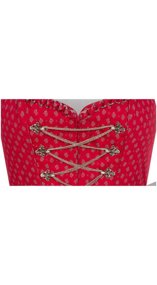 Dieses lange Baumwoll-Dirndl ist eine perfekte Mischung aus Landhausstil und Festlichkeit. Das moderne Punkt-Blümchen-Muster in Rot-Grau verleiht dem Kleid eine besondere Note. Der herzförmige Ausschnitt ist mit einer dekorativen Borte umrandet und die elegant verzierten Miederhaken zum Schnüren sowie der Reißverschluss auf der Vorderseite sorgen für eine perfekte Passform.