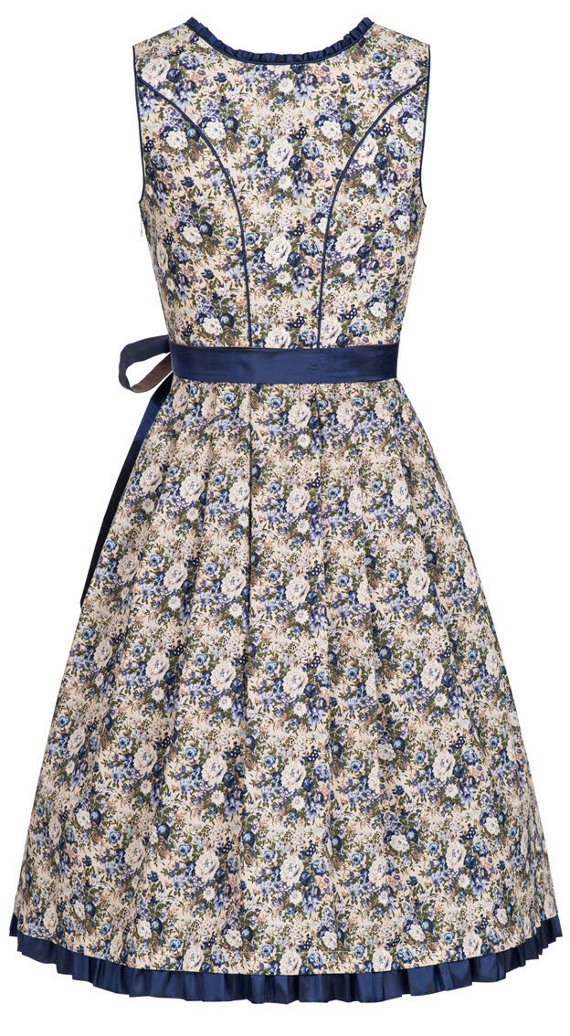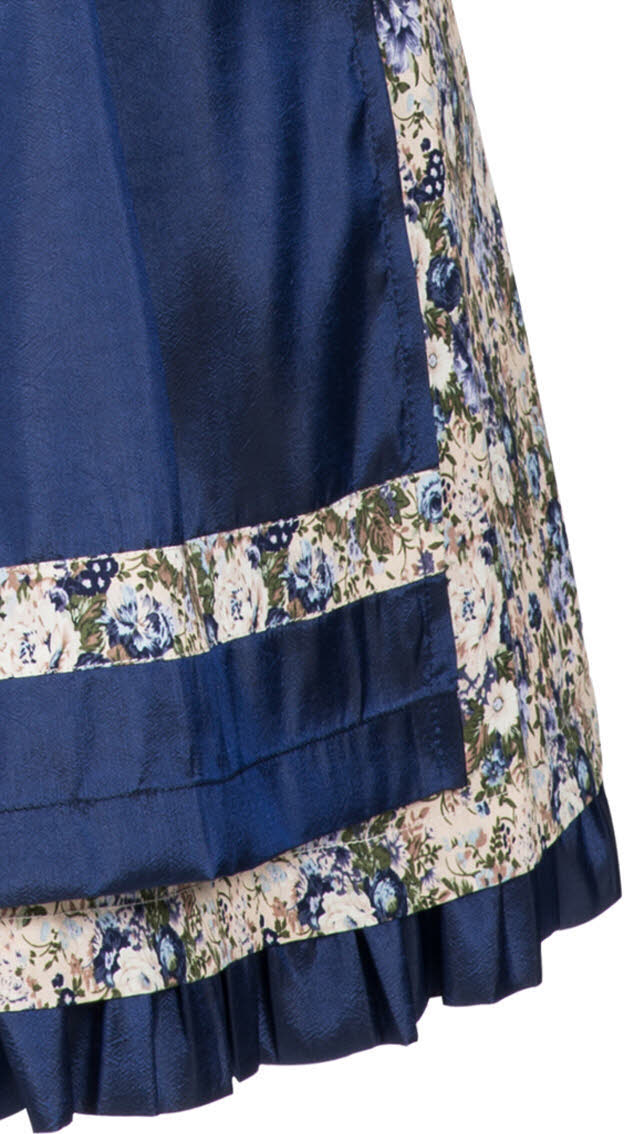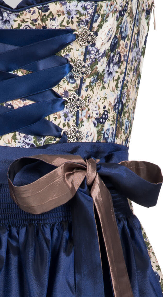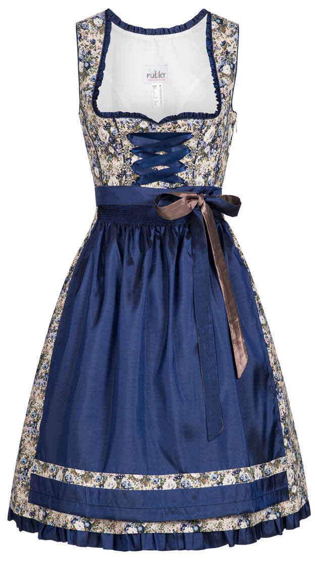 Wer sagt, dass es immer ein traditionelles Dirndl sein muss? Dieses Dirndl aus dem Hause Nübler ist von einer besonderen Art. Der herzförmige Ausschnitt wird mit einer Organza-Rüsche betont. Das Oberteil wird von acht Miederösen und einem breiten Dunkelblauen Satinband geschmückt. Die Teilungsnähte sind ebenfalls mit Dunkelblauen Paspeln betont. Das gesamte Dirndl ist mit wunderschönen Blumenmuster bedruckt. Den Rocksaum rundet eine geraffte Bordüre in Dunkelblau ab. Die edle Schürze in Dunkelblau ist am Saum mit einer Borte des Dirndlstoffs versehen. Die Schnürbänder sind zweifarbig. Mit diesem Midi-Dirndl machen Sie garantiert auf jeder Hochzeit, Kommunion, Taufe, Firmung, Familienfeier oder jedem weiteren Fest eine gute Figur.