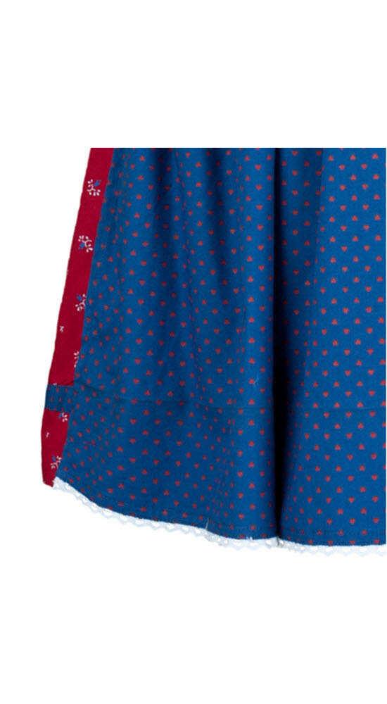 Das Kinderdirndl Emilia ist ein traditionelles Modell aus dem Hause Nübler. Der runde Ausschnitt ist mit einer zweifarbigen Froschmaulborte geschmückt. Die silbernen Miederhaken sind blütenförmig und mit einem Glitzerstein verziert. Das seidige blaue Band macht die Miederschnürung zu einem Blickfang. Das Kleid ist traditionell mit kleinen Streublumen versehen. Bezaubernd dazu ist die Dirndlbluse, die an den Ärmel und am Ausschnitt eine kleine schöne Borte hat. Das Dirndl ist hinten mit einem Reißverschluss zu schließen. Die blaue Schürze ist mit kleinen roten Herzen verziert und hat zusätzlich am Saum eine gehäkelte Borte und rundet so das Dirndl ab. Mit diesem Kinder-Dirndl wird das Mädchen garantiert zum Hingucker auf jeder Hochzeit, Kommunion, Taufe, Firmung, Konfirmation, Familienfeier oder jedem anderen Fest.