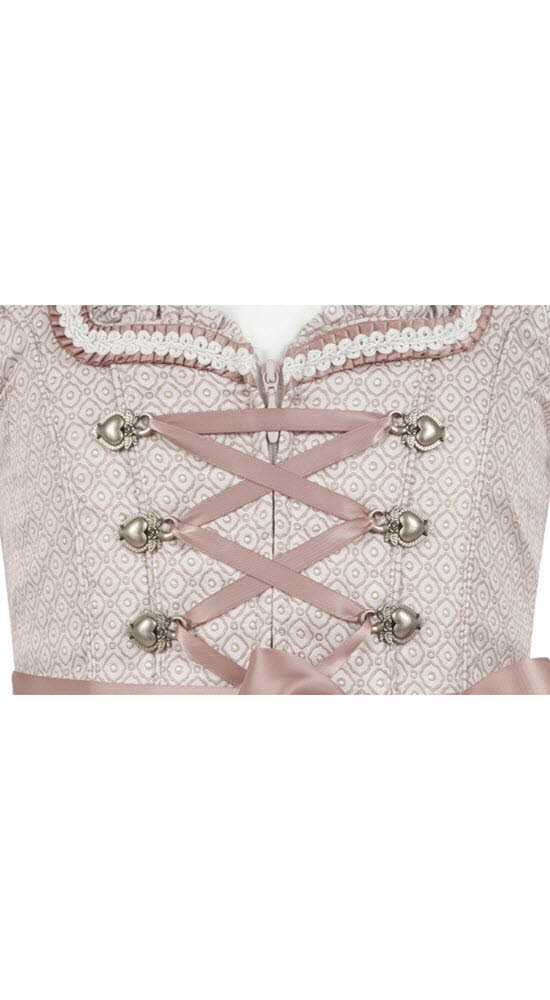 Das Kleid ist aus einem hochwertigen Stoff in Taupe Rosa gefertigt, der mit einem dezenten Karo Muster verziert ist. Der herzförmige Ausschnitt ist mit einer sehr eleganten zweifarbigen Borte eingefasst, die dem Dirndl einen edlen Touch verleiht. Der Reißverschluss befindet sich auf der Vorderseite und ist mit einer farblich passenden Dirndl Schleife geschmückt.