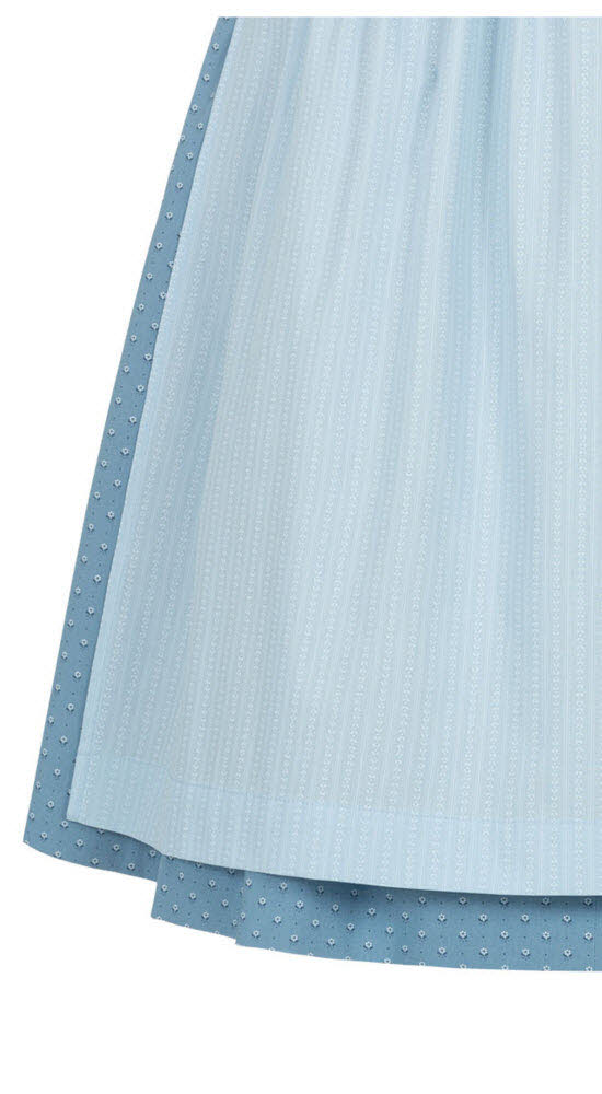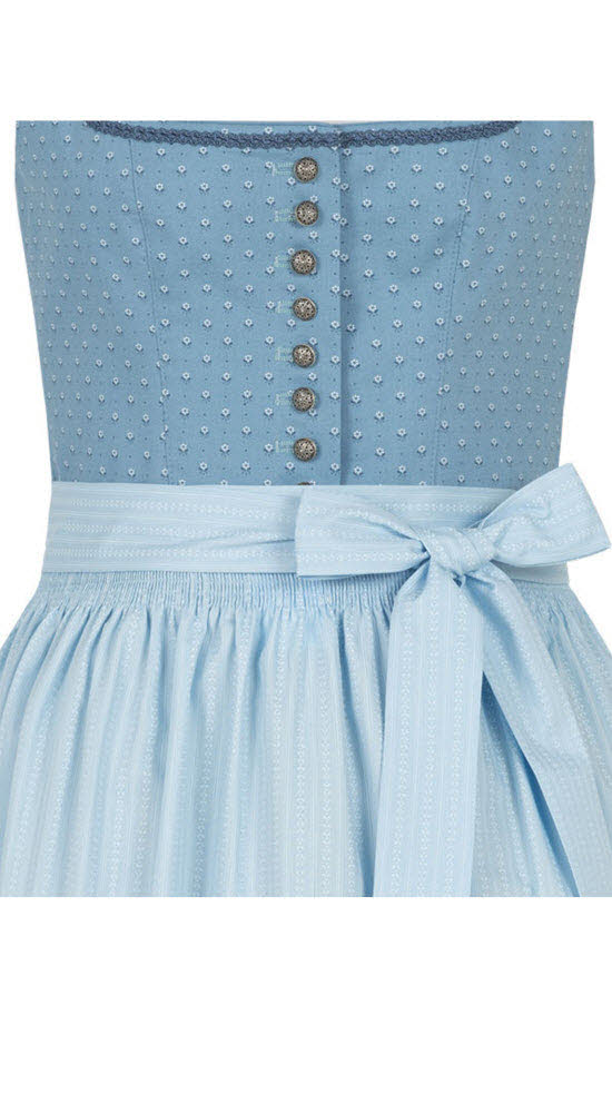 Unser Dirndl Anna in Blau ist ein Dirndl für Jung und Alt. Das Oberteil hat einen eckigen Ausschnitt, den eine wunderschöne dunkelblaue Borte schmückt. Verschlossen wird das Dirndl vorne durch eine Knopfleiste im Altsilberlook. Das Kleid ist mit kleinen Blümchen bedruckt und wirkt dadurch sehr romantisch. Zum eleganten Hingucker wird das Kleid durch die hellblaue Schürze, die durch die weißen Streifen und Ranken noch heller wirkt. Sie sind in diesem Dirndl für jede Veranstaltung richtig gekleidet.