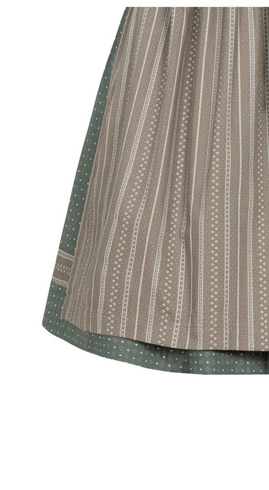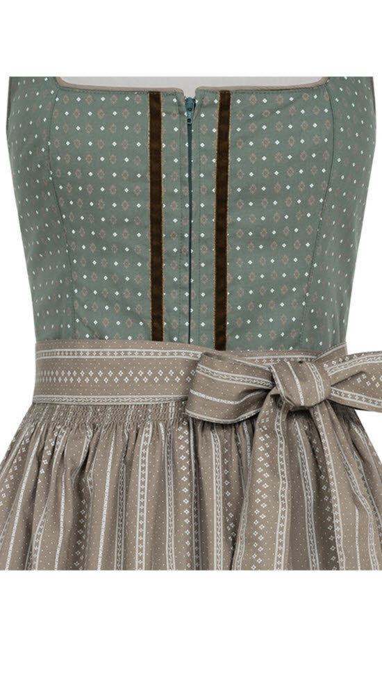 Sie wollen in traditioneller Tracht zum nächsten Fest? Dann haben wir das richtige Dirndl für Sie. Unser Midi Dirndl Franzi in Salbei von Nübler ist ein Kleid, welches Sie durch seine schlichte Eleganz sehr gut in den Alltag integrieren können. Das Muster besteht aus dezenten Rauten in Braun und Weiß, die wie kleine Blümchen aussehen. Der eckige Ausschnitt ist von einer zarten Borte umrandet. Geschlossen wird das Dirndl vorne durch einen Reißverschluss. Beidseitig am Reißverschluss entlang sind zwei braune Samtborten angebracht, die das Gesamtbild verfeinern. Auf der rechten Seite befindet sich eine durch einen Reißverschluss verschließbare Eingriffstasche, in der Sie Ihre Kleinigkeiten verstauen können. Die Schürze ist hellbraun und hat ein weißes Muster im Streifendesign. Den Rock ziert am unteren Ende eine Borte im Schürzenmuster, die mit der Schürze harmoniert. Sie werden in diesem Dirndl nicht nur blendend aussehen, sondern auch sehr lange Freude daran haben.