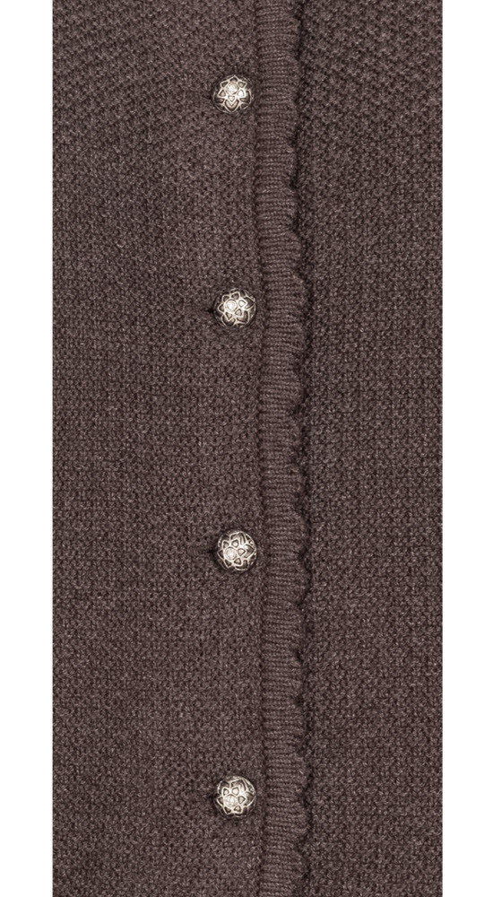 Diese schicke Strickjacke Yvonne in Braun ist perfekt für das fesche Dirndl-Outfit an kühlen Tagen oder lauen Sommerabenden. Die Jacke wird vorne mit hübschen Metallknöpfen geschlossen. Diese sind mit Strasssteinchen versehen. Am Kragen, entlang der Knopfleiste und am Saum der Jacke sind kleine Rüschen angebracht. Sie ist vielseitig kombinierbar und passt daher zur alltäglichen Hose, zum Dirndl oder zum Rock.