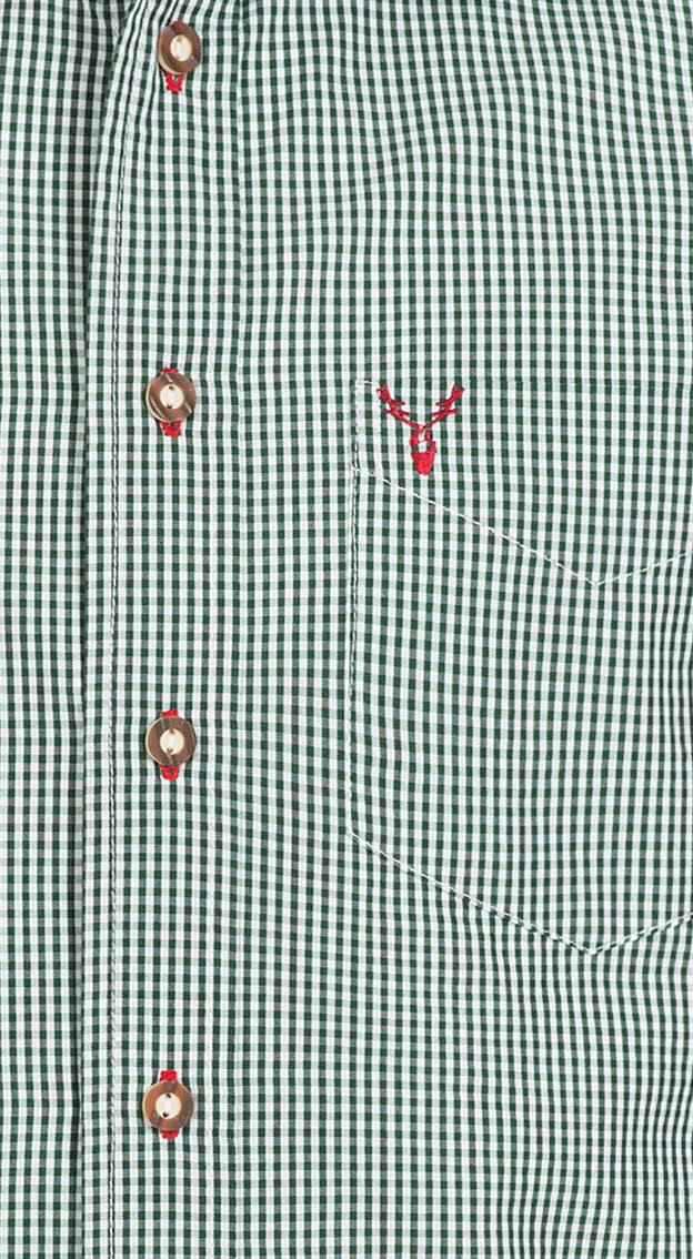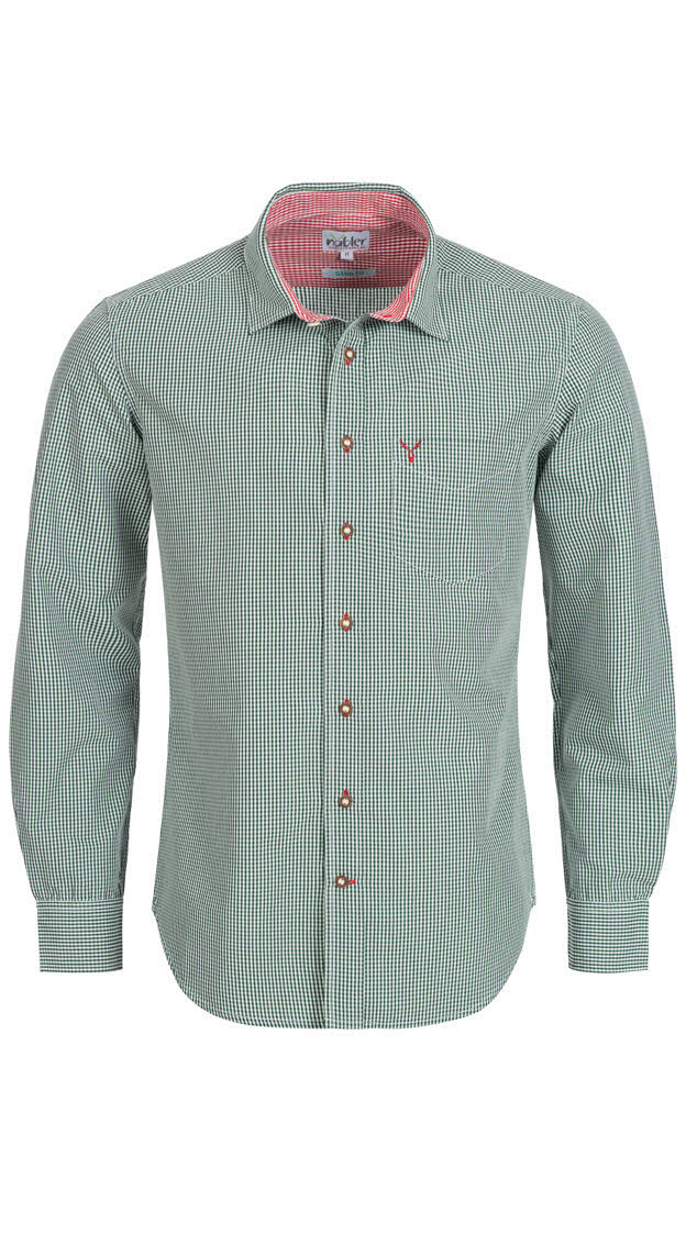 Mit dem Trachtenhemd Ralf von Nübler sind Sie auf dem Oktoberfest richtig fesch gekleidet! Das Grün karierte Hemd wird durch das innen liegende Rote Karo-Muster am Liegekraken und den Ärmeln optisch aufgelockert. Der Slim-Fit Schnitt des Hemdes betont die Körperform und ist vor allem für schlanke Träger geeignet. Auf der linken Brust befindet sich eine praktische Tasche, auf der ein kleiner Hirsch aufgestickt wurde. Durch einen kleinen Knopf können die Ärmel nach oben gekrempelt und fixiert werden.