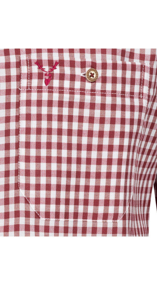 Das Trachtenhemd Sepp im traditionellen Karomuster ist der perfekte Begleiter für laue Kirwaabende. Es ist in den Farben Weinrot und Weiß gehalten. Vorne links ist eine Brusttasche angebracht, welche mit einer perfekt farblich dazu passende Hirschstickerei verziert ist. Das Hemd wird mit Knöpfen in Hirschhornoptik verschlossen.