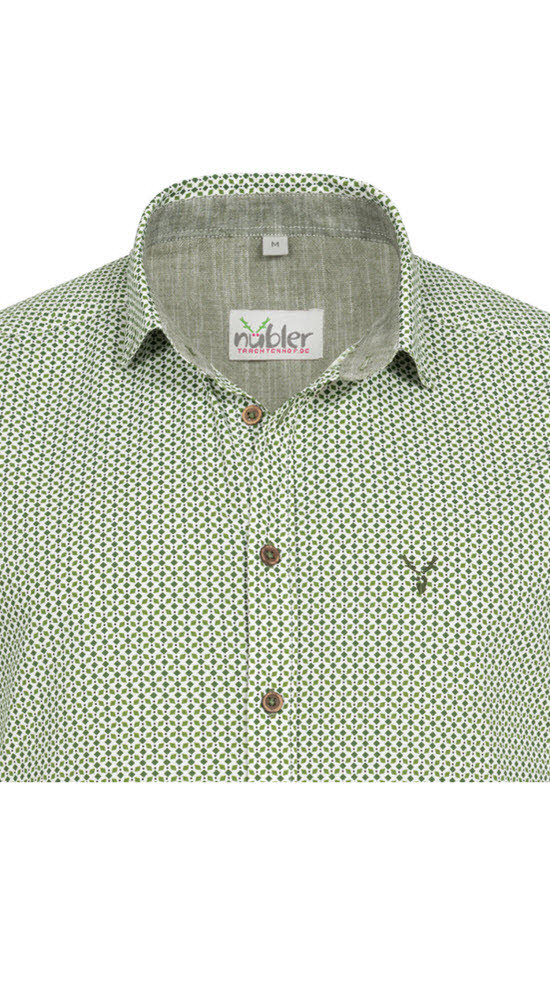 Sie sind auf der Suche nach einem besonderen Hemd für das nächste Oktoberfest? Unser Langarm Trachtenhemd Pirmin in Grün von Nübler ist einzigartig in seiner Musterung. Kleine Rauten, Quadrate und Punkte ergeben ein extravagantes Muster. Auf der linken Brust ist ein kleiner Hirsch aufgestickt, der ein traditionelles Aussehen verleiht. Die Knöpfe in Holzoptik sorgen zusätzlich für einen trachtigen Look. Durch kleine zusätzliche Knöpfe kann der Kragen fixiert werden.