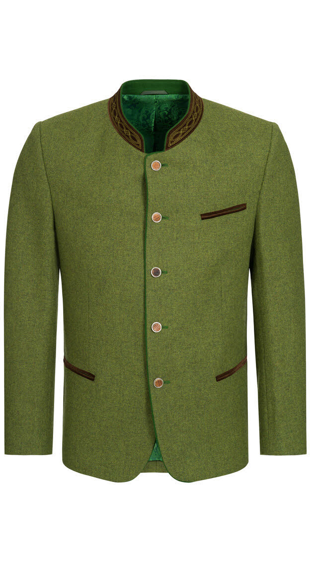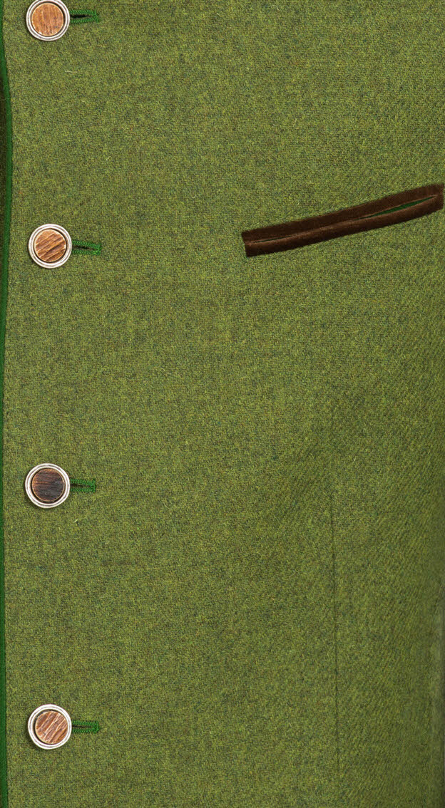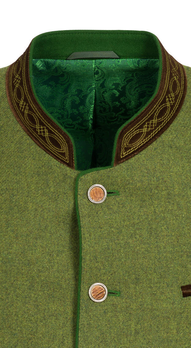 Der Trachtenjanker Admont von Kaiseralm ist vielseitig kombinierbar. Er besteht aus Schurwolle in einem hellen Grünton. Die Brusttasche und die beiden Leistentaschen sind jeweils in Braun ab gepaspelt und runden den Janker perfekt ab. Der Kragen ist rund geschneidert und in dem gleichen Braunton kontrastierend abgesetzt. Im Innenfutter befinden sich drei weitere Taschen. Der Janker wird mit fünf Knöpfen in Hirschhornoptik verschlossen. Dieser schicke Trachtenjanker ist perfekt kombinierbar und kann damit im Alltag als auch auf jeder Hochzeit, Kommunion, Taufe, Firmung, Konfirmation und Familienfeier getragen werden.