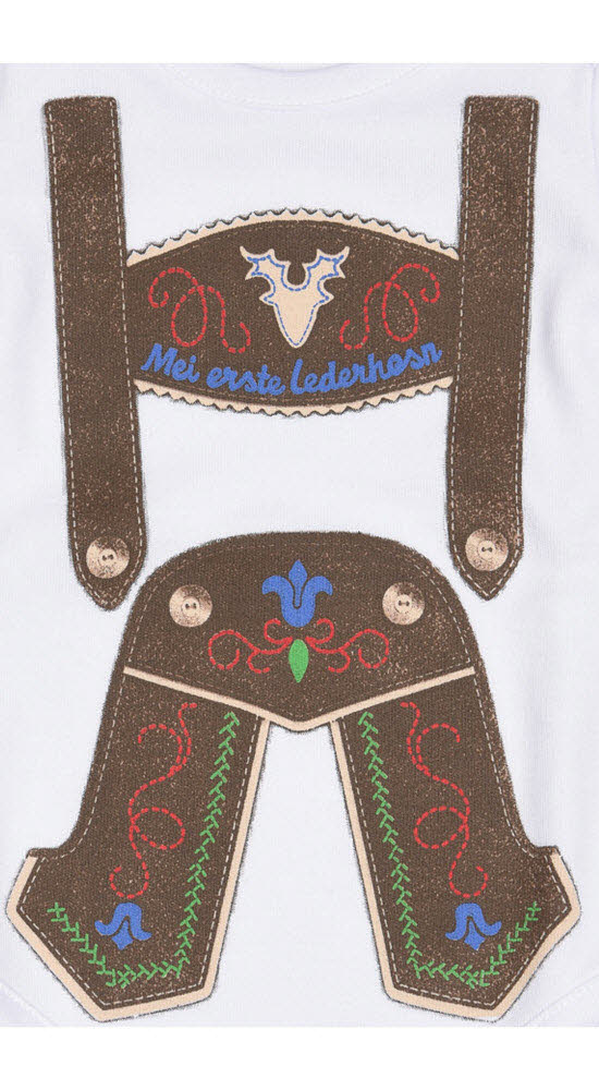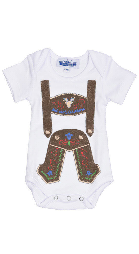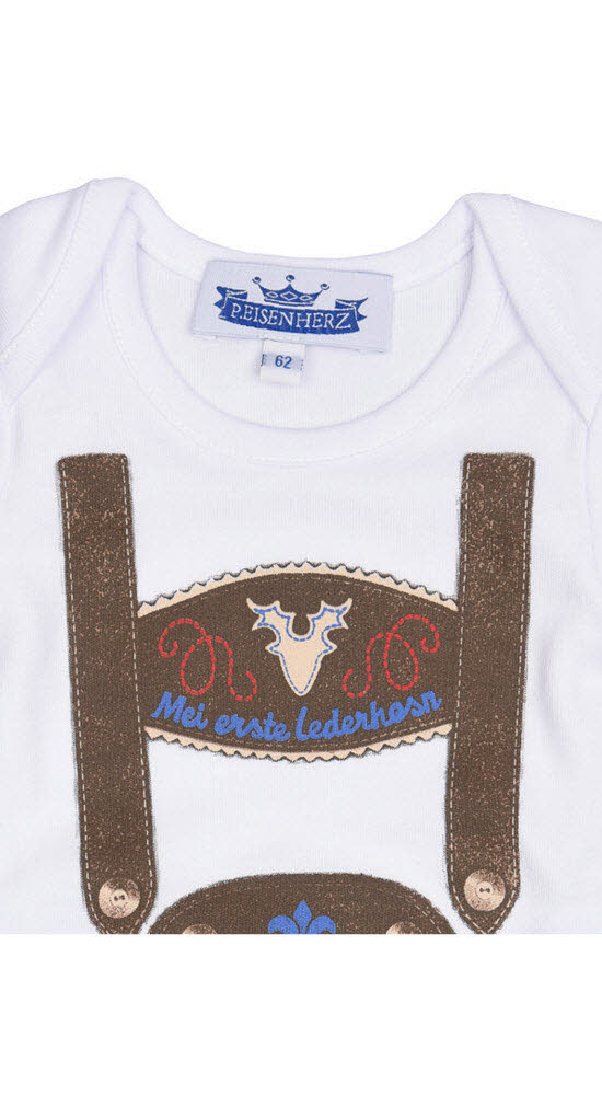 Sie möchten gerne ihrem Lausbub ein Stück Tradition schenken? Dann ist der Baby-Body in Weiß-Braun von P. Eisenherz mit dem Schriftzug âMei erste Lederhos´nâÜ genau das richtige. Der Body ist in Lederhosenträger-Optik gearbeitet. Ein kleiner Hirschkopf, Hirschhornknöpfe und verschiedene Muster zieren das Vorderteil. Durch die Druckknöpfe zwischen den Beinen ist es ein leichtes zum Anziehen oder fürs Frischmachen.