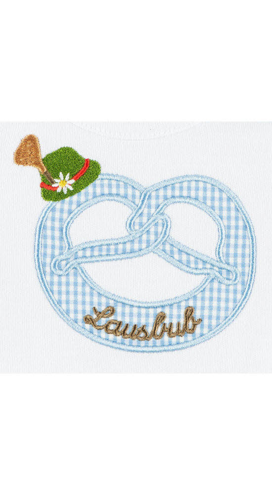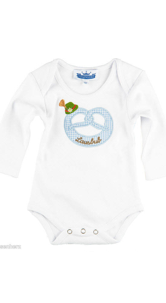 Ideal für kleine Lausbuben! Der tolle langärmelige Body ist aus 100% Baumwolle und daher optimal für die zarte Babyhaut. Die hochwertige Brez´n - Applikation mit der Lausbub-Stickerei ist ein echter Hingucker. Zudem wird die Brez´n von kleinen Stickereien verziert. Ein Must-Have für jeden kleinen Anfänger-Trachtler.