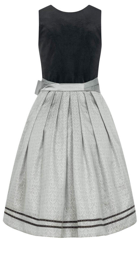 Mit dem Dirndl Emmi in Anthrazit von Nübler, treten Sie auf jedem Fest stets elegant auf. Der Mieder sticht durch ein weiches Samtstoff hervor und lässt es elegant wirken. Der Rock hat ein gleichmäßiges Paisleymuster. Altsilberfarbene wunderschöne Blütenknöpfe dienen dem feinen Mieder als Verschluss. Die schimmernde Dirndlschürze verleiht dem Dirndl noch mehr Ausstrahlung. Das Schürzenband wird zur festlichen Schleife in der Taille gebunden. Das Dirndl Emmi ist eine Mischung aus festlich und modern, die Sie zu jedem Anlass tragen können.