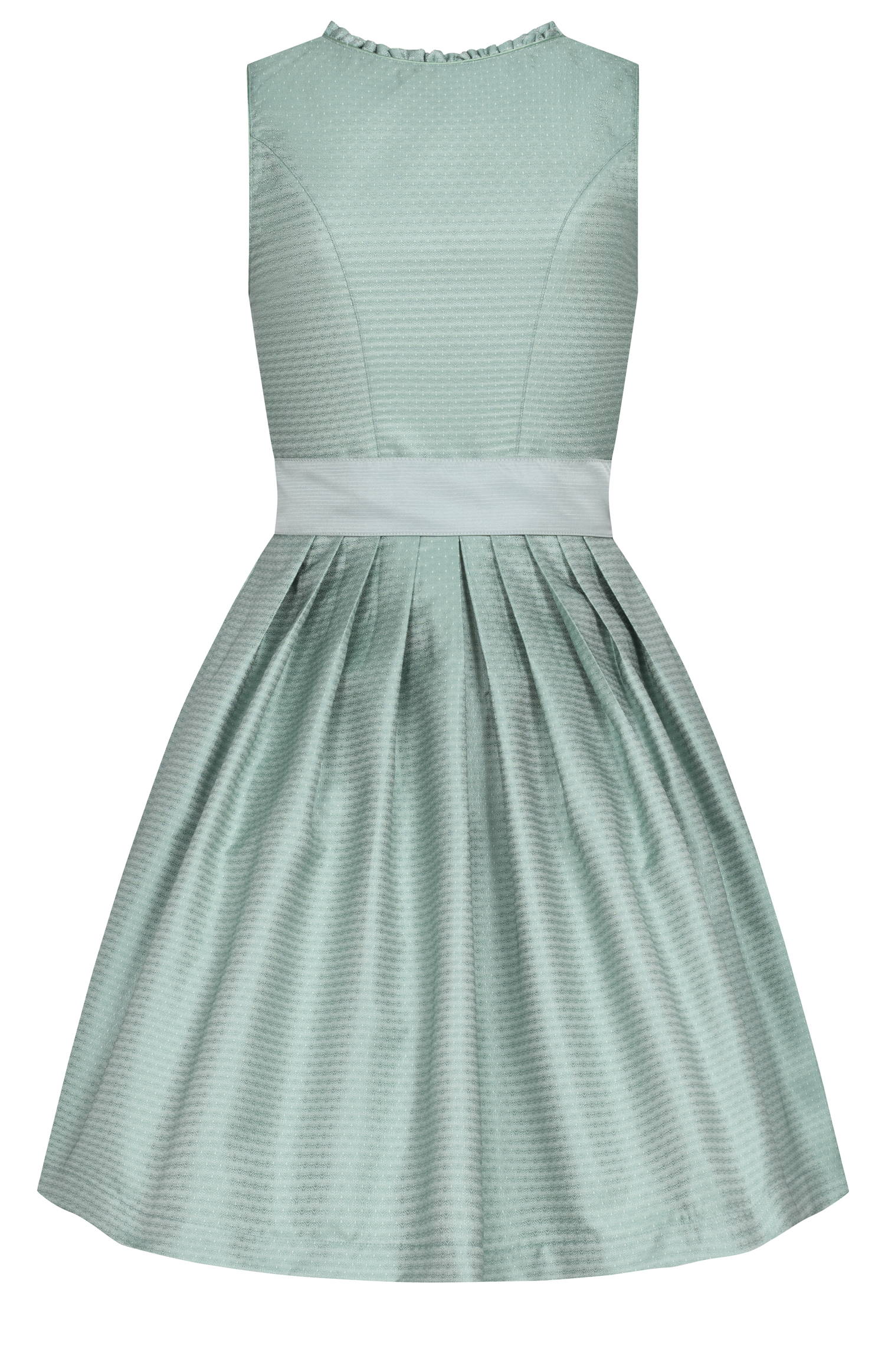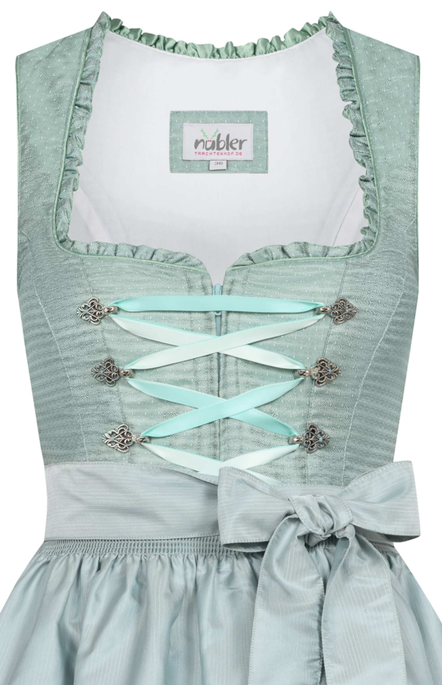 Das Midi Dirndl Gabrina in Grün von Nübler begeistert mit zarter Eleganz und einem modernen Pastell-Ton, der Leichtigkeit und Stil vereint. Das fein strukturierte Mieder mit dezentem Glanz wird durch einen herzförmigen Ausschnitt betont, der mit einer femininen Rüschenborte und altsilberfarbenen Miederhaken liebevoll verziert ist. Die doppelte Satin-Schnürung in Mint- und Silbertönen sorgt für einen edlen Akzent, während der Reißverschluss auf der Vorderseite das An- und Ausziehen angenehm erleichtert. Der Rock in leicht changierender Optik schwingt sanft bei jeder Bewegung und bietet mit einer seitlichen Eingriffstasche praktische Funktionalität. Die schimmernde Schürze in pastelligem Grün rundet das Gesamtbild harmonisch ab – ein Dirndl, das moderne Frische mit traditioneller Raffinesse kombiniert.