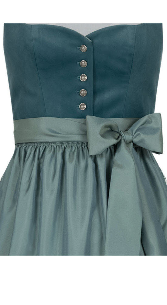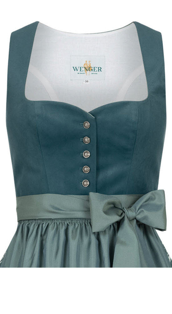 Edel schmiegt sich das petrolfarbende Dirndl Lauri von Wenger mit seinem Samtmieder an seine Trägerin. Der Ausschnitt erinnert an ein liebendes Herz und verläuft etwas rund. Altsilberfarbene, runde Trachtenknöpfe mit wunderschöner Prägung und je einem Strasssteinchen in der Mitte dienen dem feinen Mieder als Verschluss.