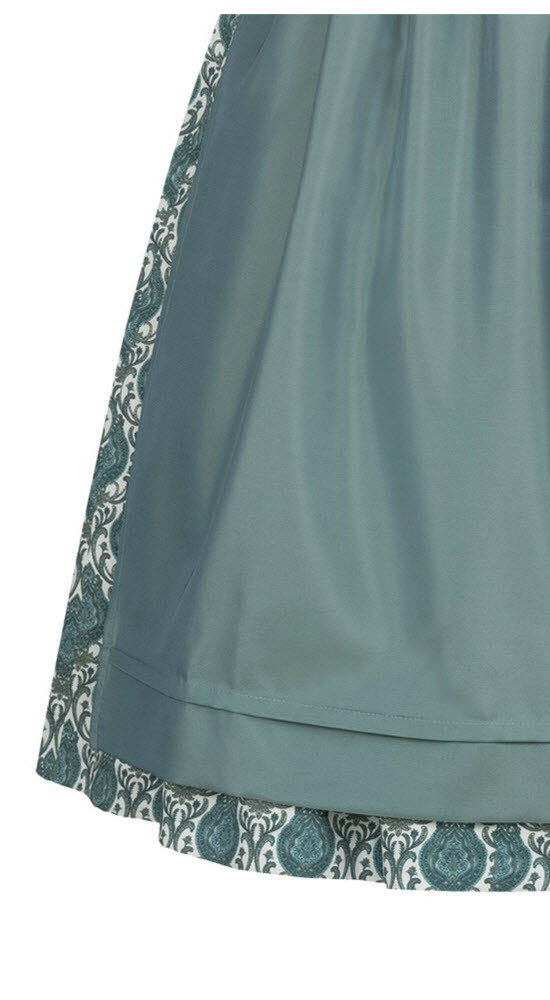 Ein gleichmäßiges Paisleymuster in verschiedenen grünen Farbtönen präsentiert sich am Dirndlrock. Im dunklen Altgrünen schimmernd legt sich die pflegeleichte Dirndlschürze über den Rock und verleiht dem Dirndl noch mehr Ausstrahlung. Das breite Schürzenband ist aus dem Stoff der Schürze, es wird zur festlichen Schleife in der Taille gebunden.
