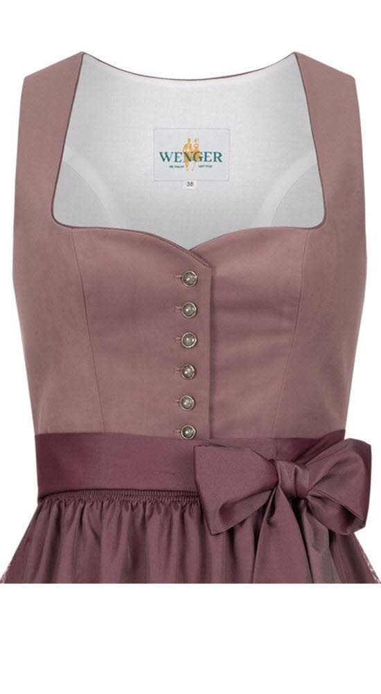 Edel schmiegt sich das rosenholzfarbene Dirndl Lauri von Wenger mit seinem Samtmieder an seine Trägerin. Der Ausschnitt erinnert an ein liebendes Herz und verläuft etwas rund. Altsilberfarbene, runde Trachtenknöpfe mit wunderschöner Prägung und je einem Strasssteinchen in der Mitte dienen dem feinen Mieder als Verschluss.