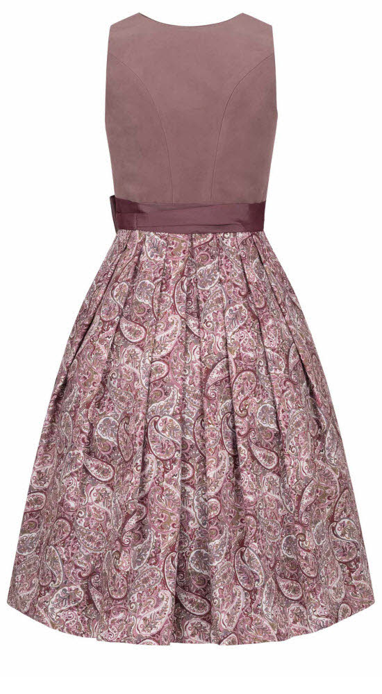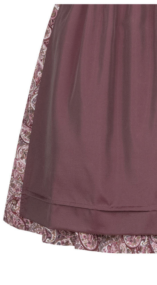 Ein turbulentes Paisleymuster in verschiedenen rosa Farbtönen präsentiert sich am Dirndlrock. Im dunklem Altrosa schimmernd legt sich die pflegeleichte Dirndlschürze über den Rock und verleiht dem Dirndl noch mehr Ausstrahlung. Das breite Schürzenband ist aus dem Stoff der Schürze, es wird zur festlichen Schleife in der Taille gebunden.