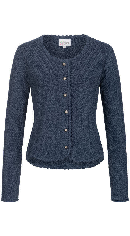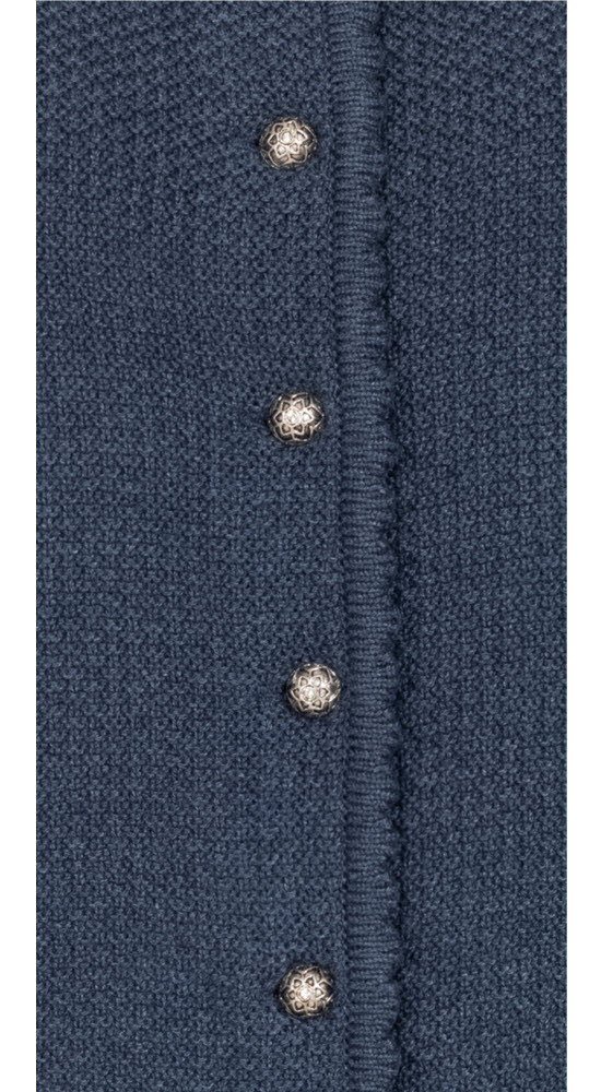 Diese schicke Strickjacke Yvonne in Blau ist perfekt für das fesche Dirndl-Outfit an kühlen Tagen oder lauen Sommerabenden. Die Jacke wird vorne mit hübschen Metallknöpfen geschlossen. Diese sind mit Strasssteinchen versehen. Am Kragen, entlang der Knopfleiste und am Saum der Jacke sind kleine Rüschen angebracht. Sie ist vielseitig kombinierbar und passt daher zur alltäglichen Hose, zum Dirndl oder zum Rock.