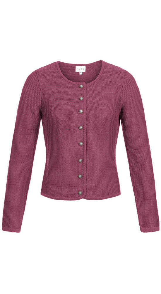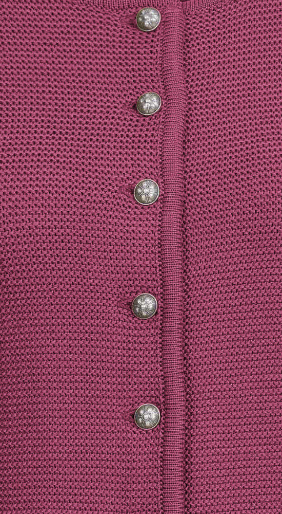 Die schlichte, sehr schöne Strickjacke  in der Farbe Bordeaux macht das Trachtenoutfit an kühleren Tagen und lauen Sommerabenden perfekt. Sie ist vielseitig kombinierbar und kann daher zur Hose, Dirndl oder Rock getragen werden. Die Jacke wird vorne mit kleinen Silberknöpfen verschlossen. Durch die Rückennähte hat sie einen taillierten Schnitt. Mit dieser schicken Strickjacke liegen Sie voll imTrend.
