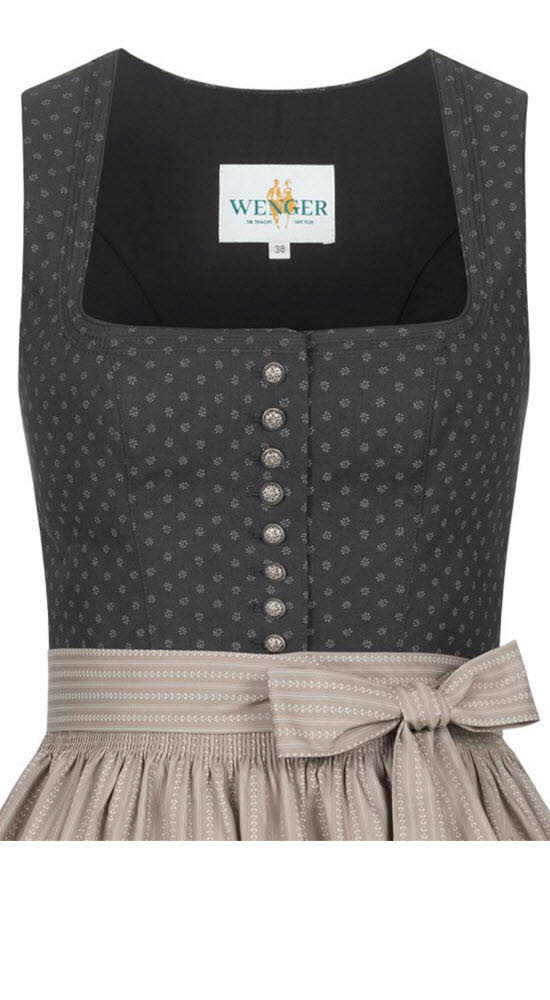 Das wunderschönes Midi-Dirndl Ulla in Anthrazit von Wenger ist ein sehr edles Dirndl mit zartem Rautenmuster. Das Oberteil hat einen eckigen Ausschnitt und wird durch eine Knopfleiste in Altsilber-Look geschlossen.
