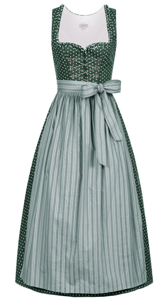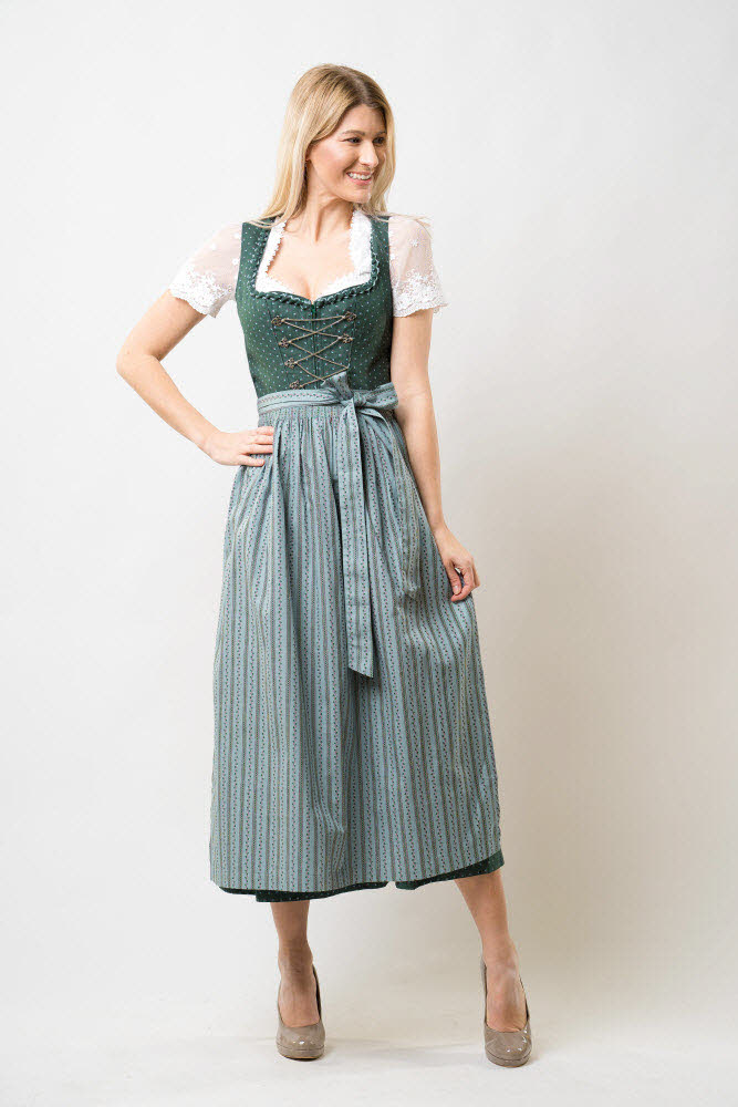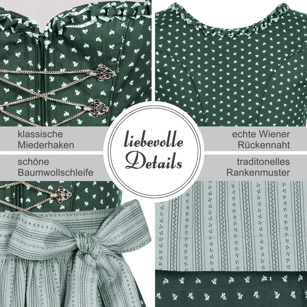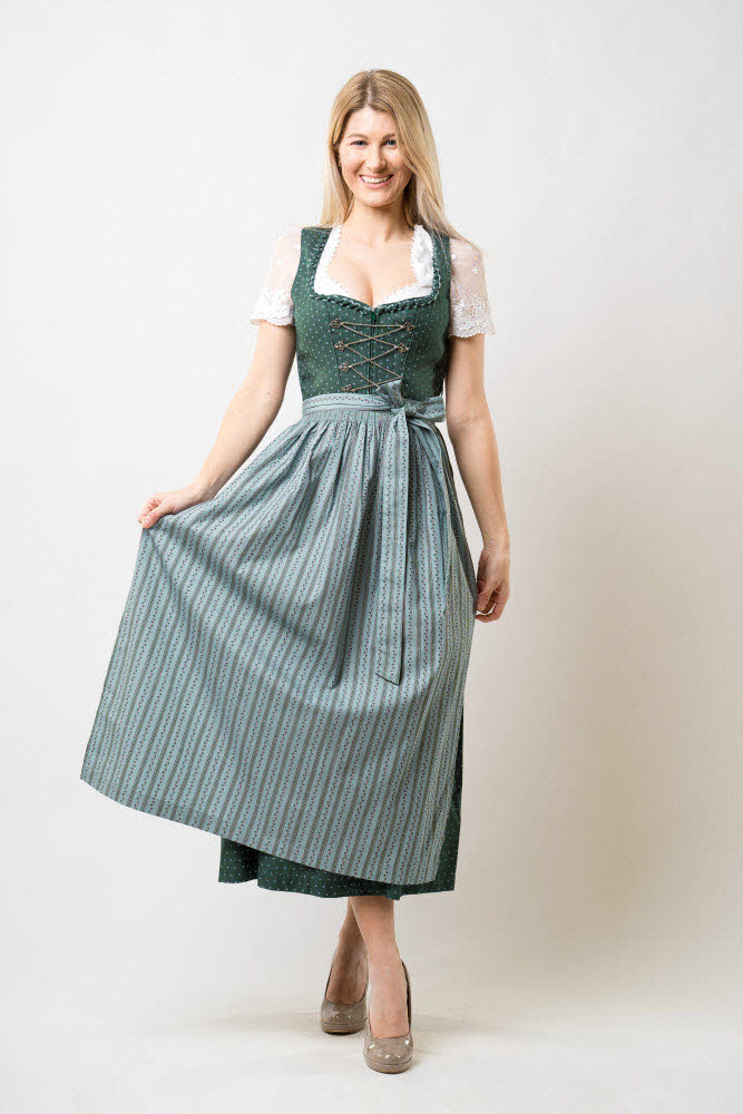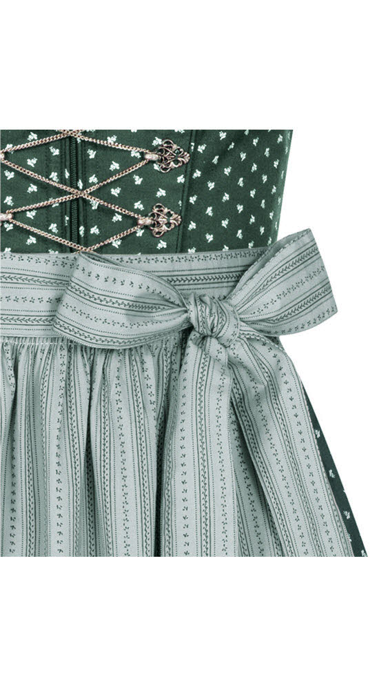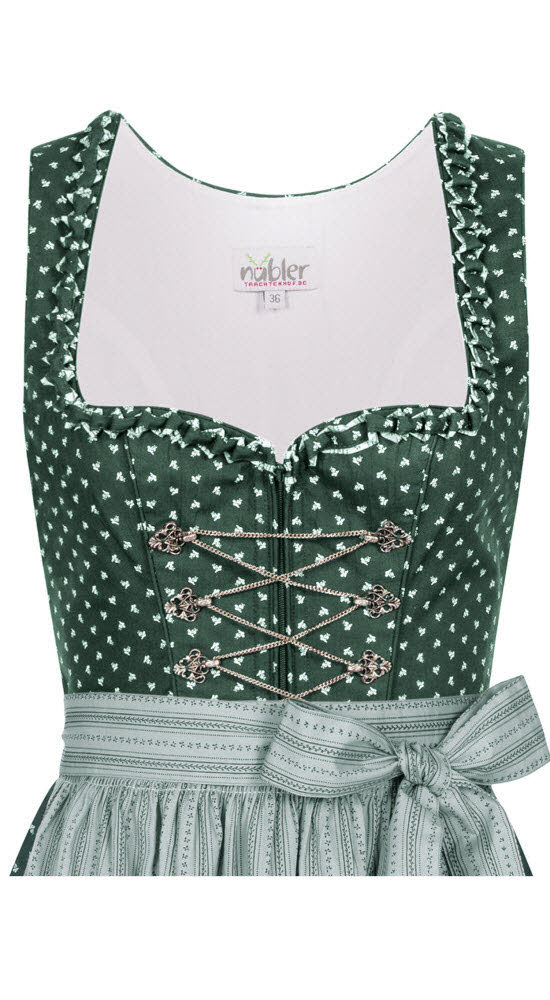 Dieses traditionelle lange Dirndl Thea von Nübler überzeugt durch die schöne Farbkombination Grün-Rosa. Der Dirndlstoff ist im Grundton Grün, welcher mit einem klassischen Blumenmuster in Weiß bedruckt ist. Entzückend ist auch die am Ausschnitt angebrachte grün-rosa Froschmaulborte. Zudem ist das Mieder mit silbernen, filigranen Miederhaken geschmückt, die durch eine feine Kette verbunden werden. Eine Eingriffstasche befindet sich auf der rechten Seite. Die perfekt dazu passende Dirndlschürze in der Farbe Rosa ist mit einem dezenten Blumen- und Streifenmuster in Grün verziert. Durch den vorne angebrachten Reißverschluss wird ein leichtes An- und Ausziehen des Dirndls ermöglicht. Dieses lange Dirndl kann im Alltag wie auch auf Festlichkeiten wie Kirchweih, Volksfesten und Familienfeiern sehr gut getragen werden.