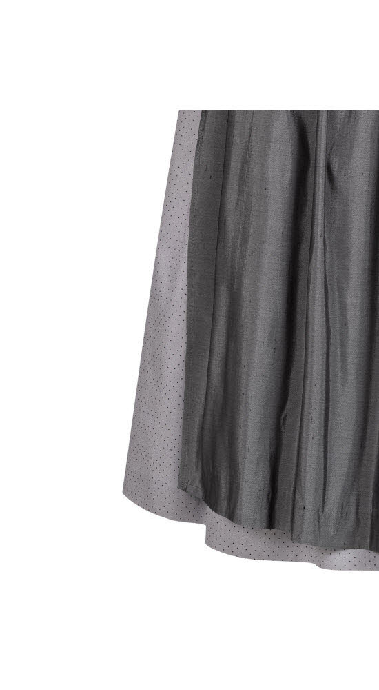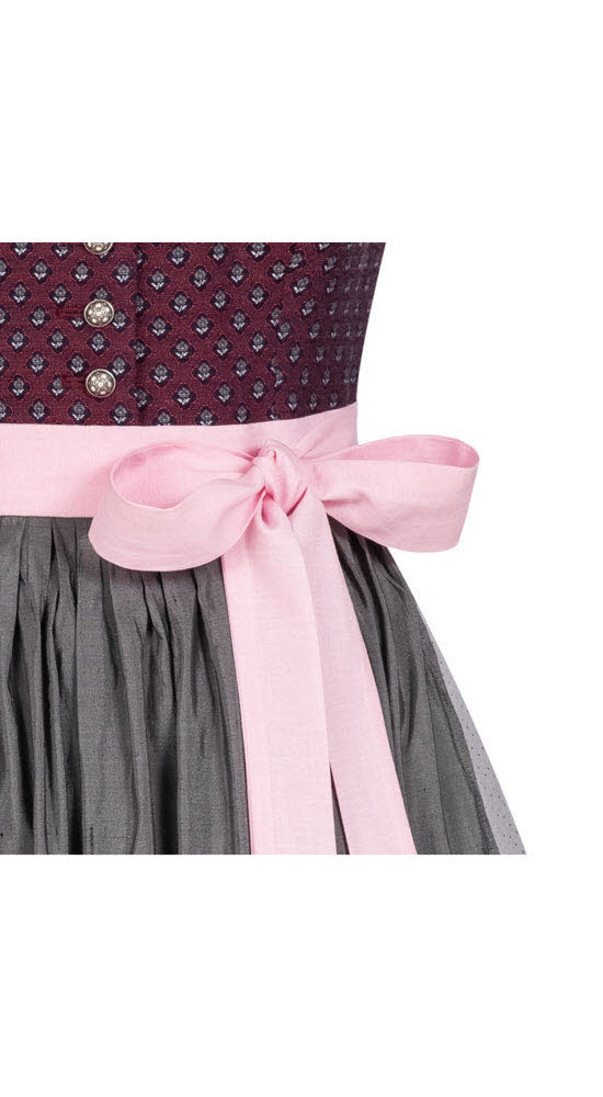 Dieses wunderschön, elegante Dirndl Anastasia ist definitiv nicht nur fesch für die Kirwa. Das hochgeschlossene Mieder ist mit einem tollen ornamentartigen Muster bestickt. Verschlossen wir das Dirndl mit auffällig glitzernden Knöpfen. Der Rock ist in einen angenehmen Grau und mit kleinen Pünktchen versehen. Die leichte Schürze ist in einem kräftigen Grau, perfekt dazu passend ist das rosa melierte Schürzenband.