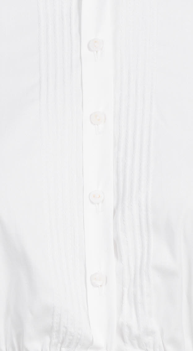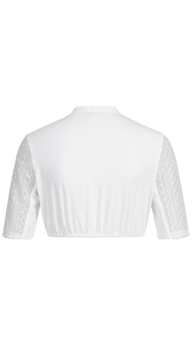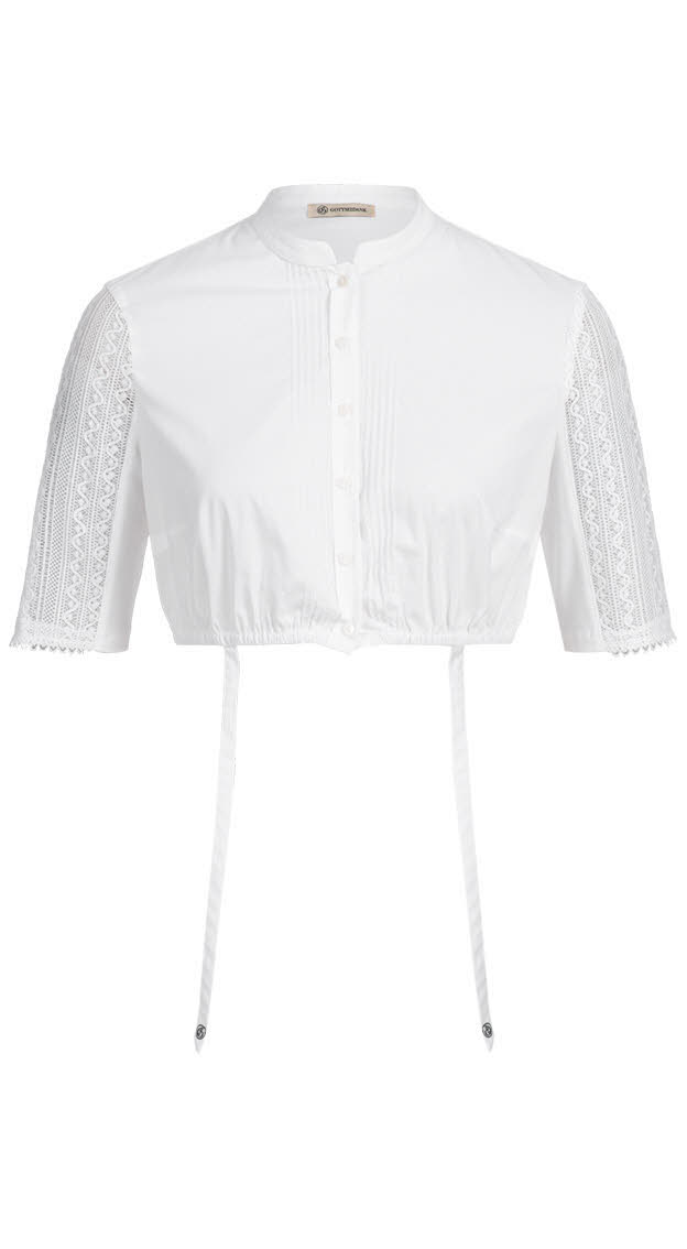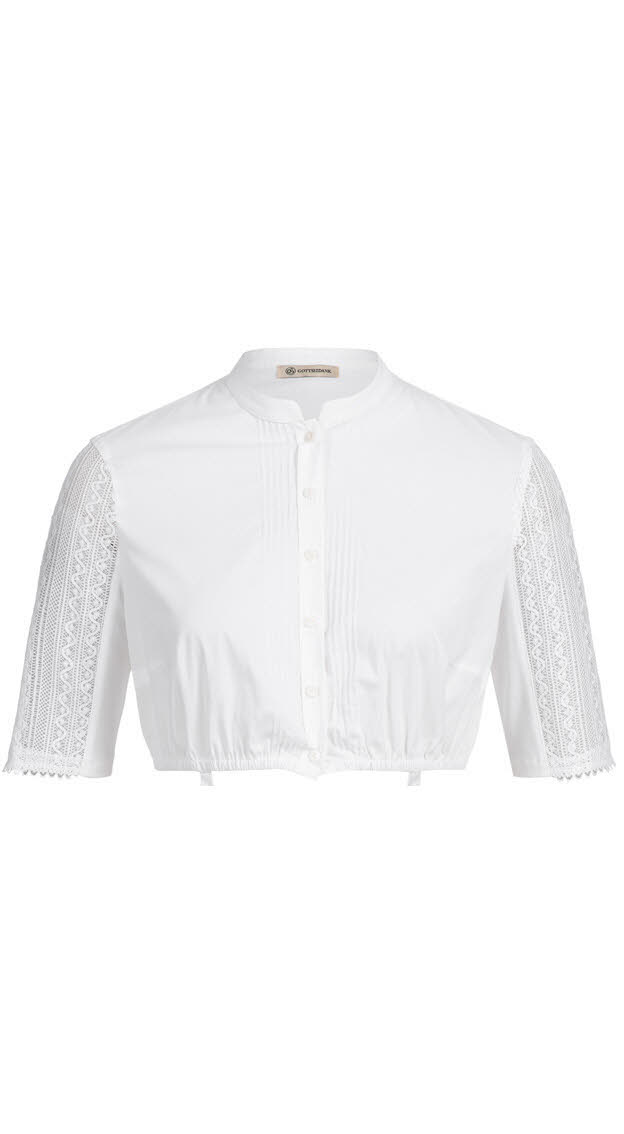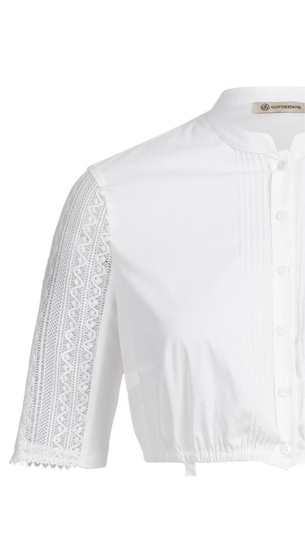 Hochwertige Dirndlbluse Lilly in Weiß der Marke Gottseidank. Die hochgeschlossene Dirndlbluse besticht mit dem schönen schmalen Spitzenärmel. Der Rücken ist aus bequemen Stretch gefertigt, genauso wie der Unterarm. Entlang der Knopfleiste sind beidseitig je 5 Biesen genäht. Geschlossen wird die Bluse mit wunderschönen schimmernden Perlmuttknöpfen. Ein perfekter Sitz ist durch den elastischen Saum garantiert. Mit den zwei angenähten Bändern kann die Bluse beim Tragen wieder in die gewünschte Form gebracht werden. Diese bequeme, wunderschöne Dirndlbluse passt sowohl zu hochgeschlossenen als auch zu ausgeschnittenen Dirndl.
