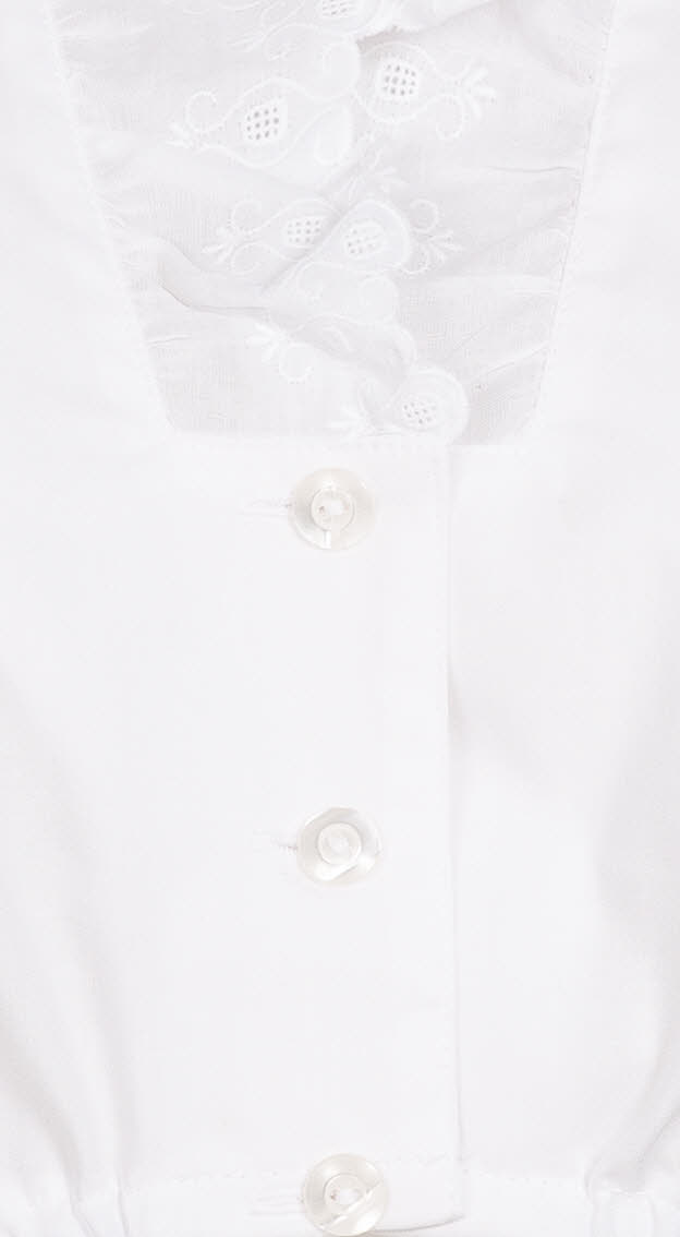 Traditionelle Dirndlbluse Rosa in Weiß von Wenger Austrian Style. Der hübsche V-Ausschnitt ist mit einer schönen, leicht gerafften Borte mit Blümchenmuster verziert. Die Ärmel sind luftig locker und etwas ausgestellt, also perfekt für die heißen Oktoberfesttage. Zu öffnen und schließen ist die Bluse mit drei Perlmuttknöpfen, wodurch das Anziehen erleichtert wird. Für den perfekten Sitz sorgt das eingearbeitete Gummiband am Blusenende.