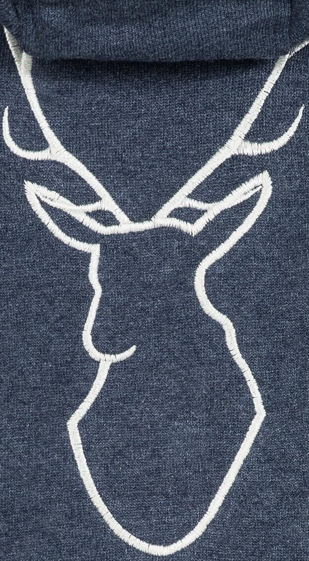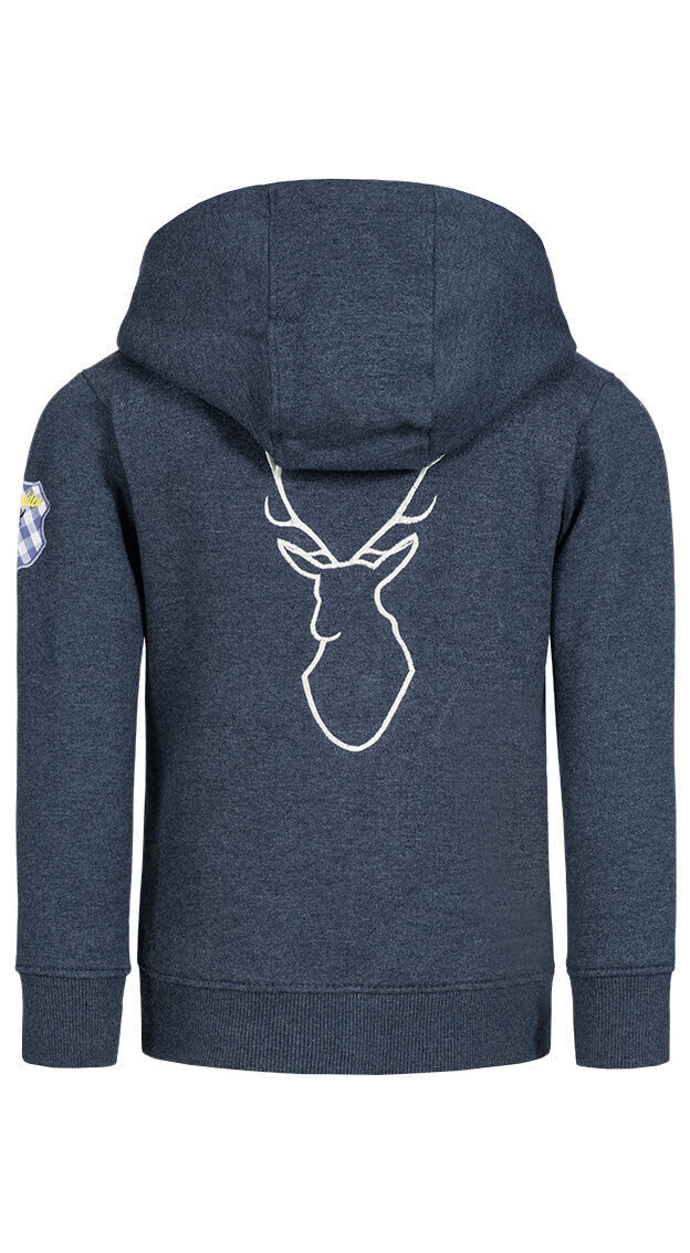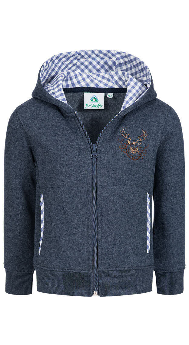 Die Sweatjacke für Kinder von Isar-Trachten in Jeansblau macht Ihren Liebsten zum Hingucker. Die zwei Bauchtaschen sind mit blau-kariertem Aufnähern versehen, auf der Brust befindet sich ein aufgesticktes Hirschgeweih und den Rücken ziert ein Hirschkopf. In der Kapuze wiederholt sich der blau-karierte Stoff und macht die Jacke zu einem liebevoll gestalteten Accessoire für die erste Kirchweih. Die Jacke wird praktisch mit einem Reißverschluss geschlossen. Diese Jacke passt sowohl zur Lederhose als auch zu jeder anderen Hose. Sie kann im Alltag wie auch auf Festlichkeiten wie Kirchweih, Volksfesten und Familienfeiern getragen werden.
