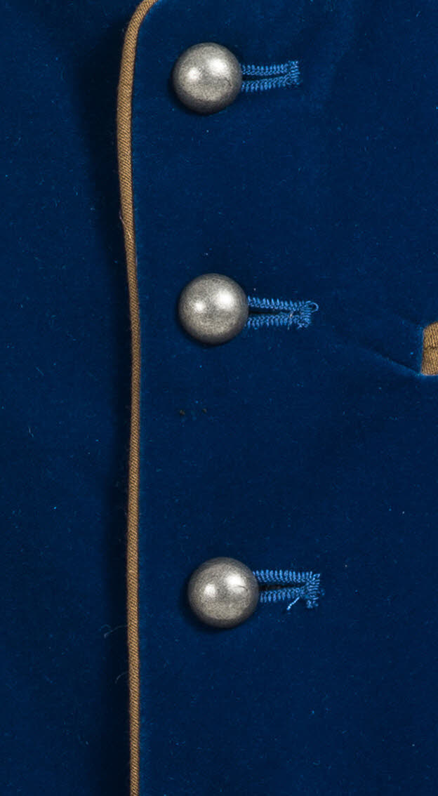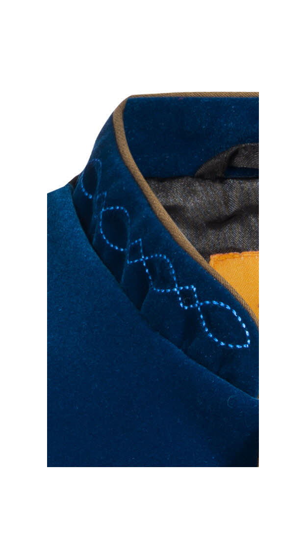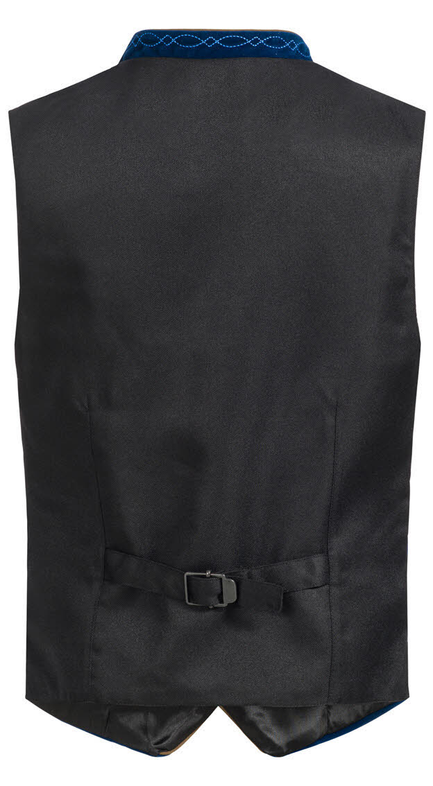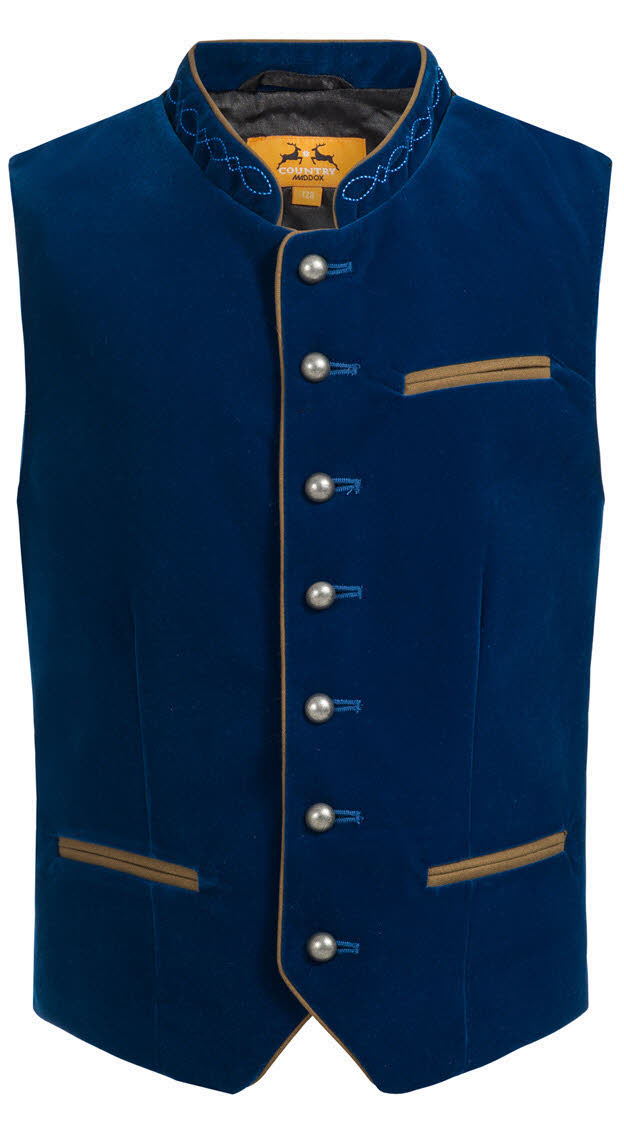 Dieses traditionelle Gilet von Country Maddox ist perfekt für den jungen Mann von heute. Das Gilet Zwiesel in Blau ist aus Samt. Die Weste und die Taschen sind mit Hellbraunen Stoff eingepaspelt. Der klassische Stehkragen ist bestickt. Zu schließen ist die Weste mit Silbernen Metallknöpfen. Abnäher und ein variabler Riegel sorgen für perfekten Sitz auf der schwarzen Rückseite. Die Weste kann zur Lederhose und auch zu einer peppigen Jeans getragen werden.