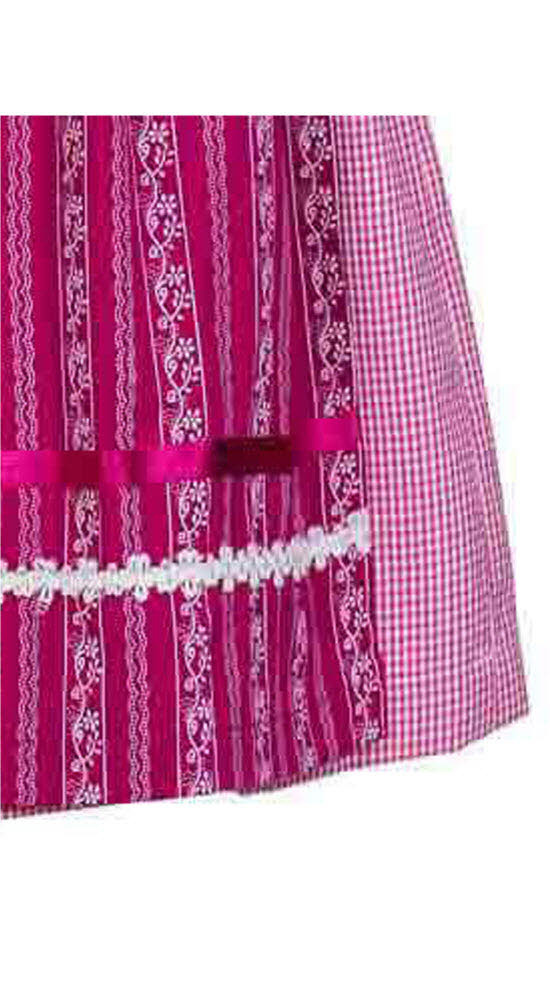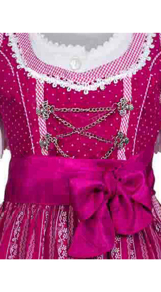 Das Kinderdirndl Anja ist ein schönes traditionelles Baumwolldirndl aus dem Hause Nübler. Eine auffallende Miederschnürung verzaubert dieses Modell. Silberfarbene Miederhaken verzieren das Oberteil. Mit einer Metallkette und einem beerefarbenen Tüllband wird das Mieder geschnürt. Zugleich ist das Oberteil mit zwei Borten verziert, die jeweils rechts und links neben den Miederhaken angebracht sind. Bezaubernd ist der runde Ausschnitt, der mit einem kleinkarierten Karo und einer kleinen Borte, umrandet ist. Mit Blumenranken und zwei kleinen Borten ist die Baumwollschürze versehen. Seidig glänzend ist das Schürzenband, das dem Baumwolldirndl ein edles Flair verleiht. Mit einem Reißverschluss ist das Dirndl hinten zu schließen. Mit diesem Kinder-Dirndl wird das Mädchen garantiert zum Hingucker auf jeder Hochzeit, Kommunion, Taufe, Firmung, Konfirmation, Familienfeier oder jedem anderen Fest.