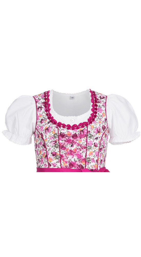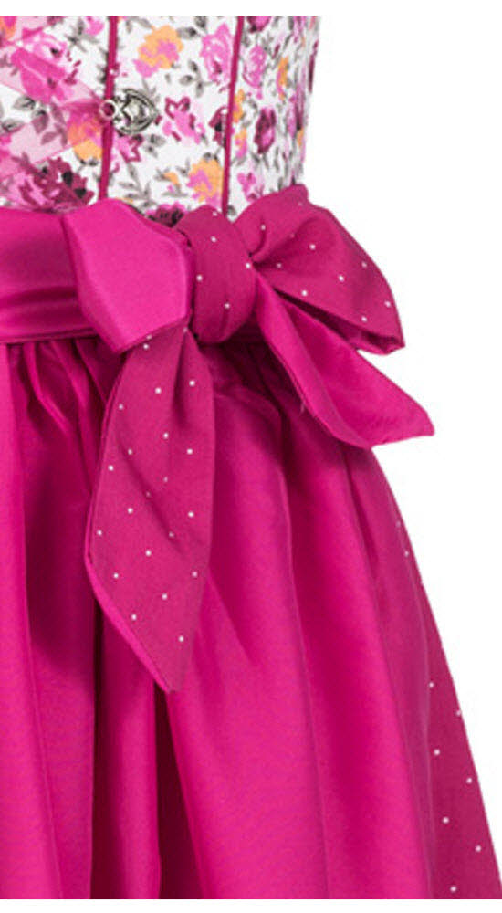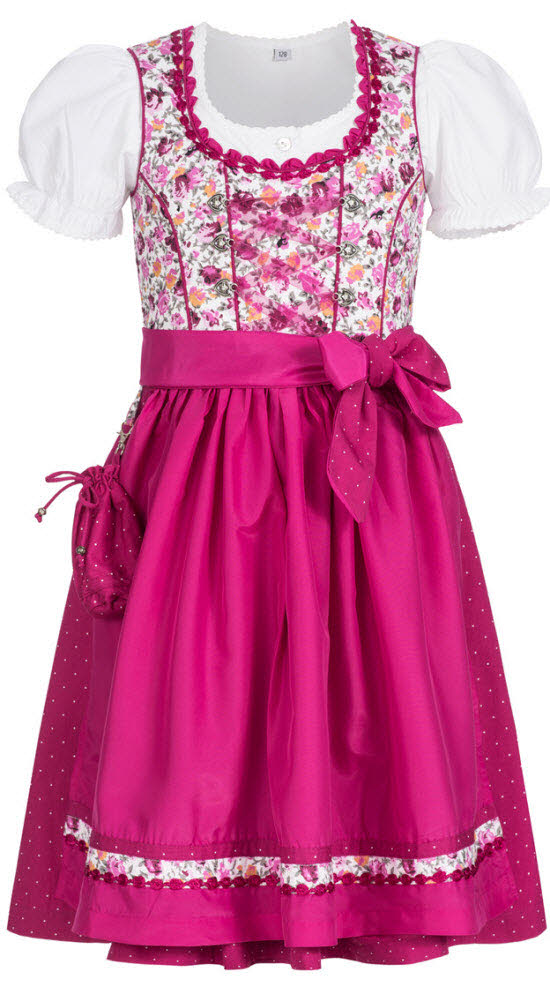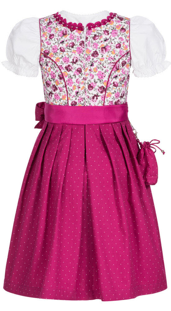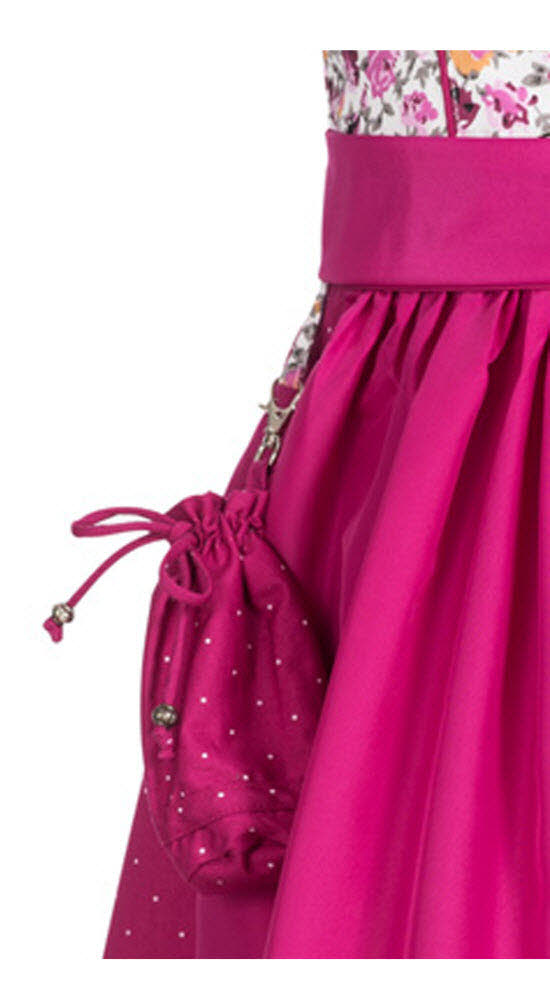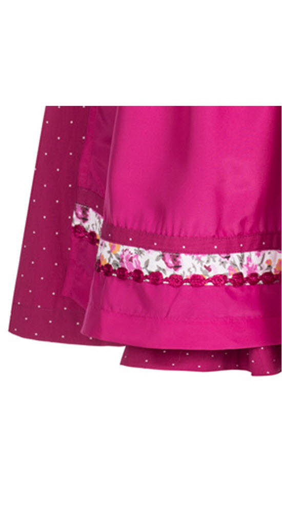 Das hübsche Kinderdirndl Naomi aus dem Hause Nübler lässt jedes Mädchen zu einer Prinzessin werden. Am Ausschnitt sind Rüschen und eine Stickerei in Beere angebracht. Das Mieder ist mit einem auffälligen Blumenprint versehen. Das Taftband in Beere wird von Miederhaken die mit Glitzersteinchen verziert sind gehalten. Das Kinderdirndl Naomi wird hinten mit einem Reißverschluss verschlossen. Der Rock ist in Beere gehalten und hat viele kleine weiße Punkte. Die glänzende Schürze ist in einem Beerenton und verleiht dem Dirndl den letzten Schliff. Ein weiteres Highlight ist das kleine Täschchen welches mit einem Karabinerhaken am Dirndl befestigt wird. Dort kann man prima sein fleißig gespartes Taschengeld verstauen. Mit diesem Kinder-Dirndl wird das Mädchen garantiert zum Hingucker auf jeder Kirchweih, Hochzeit, Kommunion, Taufe, Firmung, Konfirmation, Familienfest oder jedem anderen Fest.