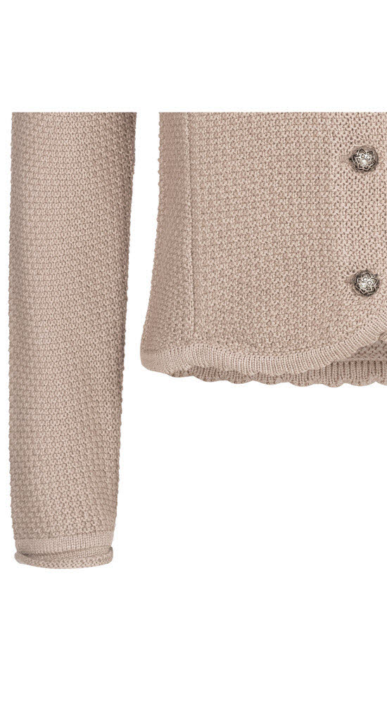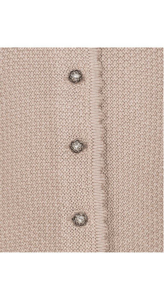 Diese goldige Strickjacke Yvonne in Natur ist perfekt für fesche Dirndl-Prinzessinnen an kühlen Tagen oder lauen Sommerabenden. Die Jacke wird vorne mit hübschen Metallknöpfen geschlossen. Diese sind mit Strasssteinchen versehen. Am Kragen, entlang der Knopfleiste und am Saum der Jacke sind kleine Rüschen angebracht. Sie ist vielseitig kombinierbar und passt daher zur alltäglichen Hose, zum Dirndl oder zum Rock.