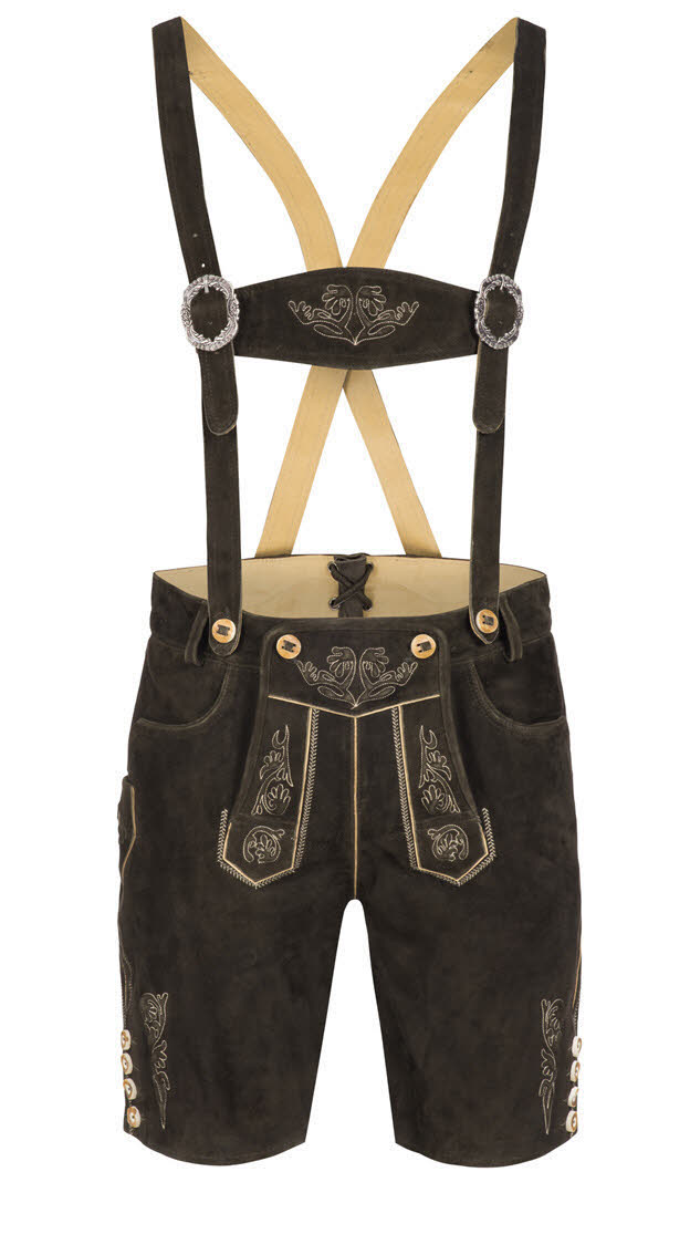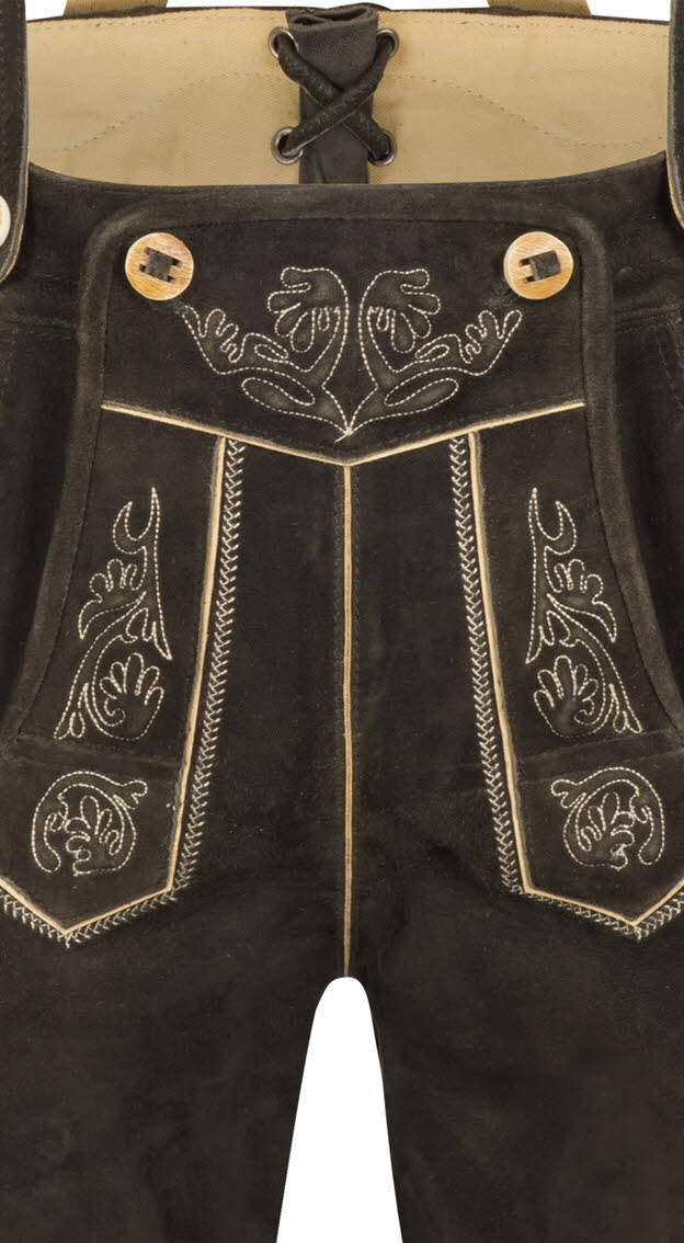 Die Lederhose Bazi in Altschwarz ist durch die schöne Reliefstickerein auf Latz und Beinen ein echter Hingucker. Für kleine Gegenstände sind vorne zwei Eingrifftaschen eingearbeitet. Weiterhin ist an der Seite eine bestickte Messertasche vorhanden, sowie eine Gesäßtasche mit Knopf. Die Träger sind in der Länge verstellbar, können aber auch jederzeit abgenommen werden. Möchte man einen Gürtel tragen, ist dies bei der Lederhose Bazi kein Problem, da hierfür extra Gürtelschlaufen eingearbeitet sind. Alle Knöpfe sind in Hirschhorn-Optik und verleihen der Lederhose den letzen Schliff. Die Rückseite der Lederhose ist mit einer Tellernaht veredelt. Die Beinabschlüsse besitzen einen Schlitz, die mit jeweils vier Knöpfen verschließbar sind. Die Lederhose ist aus hochwertigen, weichem Ziegenvelours gefertigt und daher sehr anschmiegsam und weist einen sehr hohen Tragekomfort auf. Mit dieser Lederhose sind Sie immer der Star, egal, ob im Alltag, auf Hochzeiten, Familienfeiern oder jedem anderen Fest.