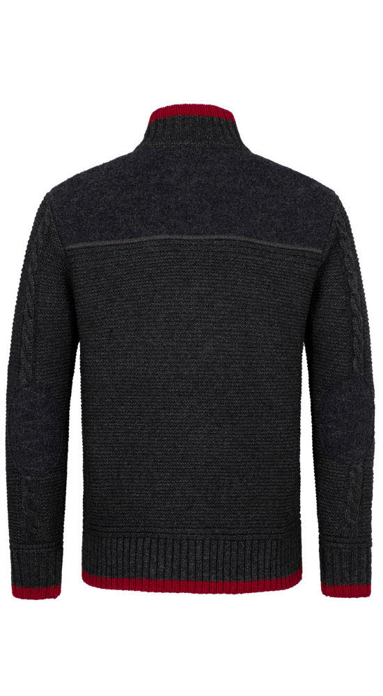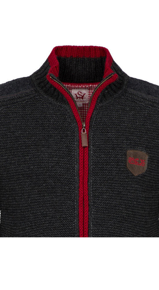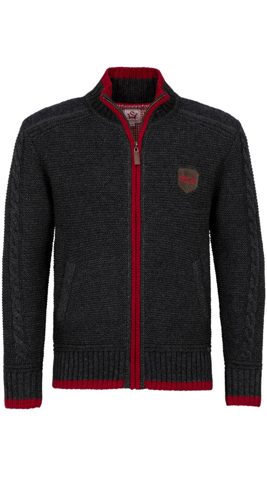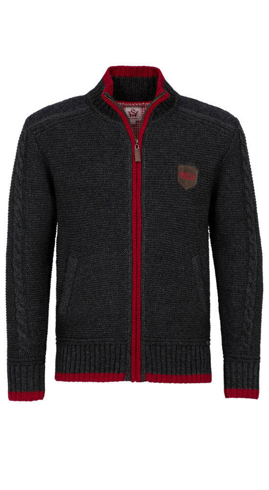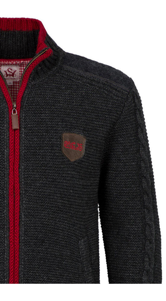 Die Trachtenjacke Fatzbach von Spieth & Wensky in Dunkelgrau und Rot. Die Jacke ist trendig, und wird mit einem modischen Reißverschluss geschlossen. Die Ärmelbündchen, der Reißverschluss und der Kragen sind in roter Farbe hervorgehoben. Fatzbach besitzt zwei Eingrifftaschen und die Ärmel werden mit einem Zopfmuster und  farblich abgesetzte Ellbogenschoner aus Filz verziert. Der Schulterbereich besteht aus einem Walkstoff. Diese Trachtenstrickjacke passt sowohl zur Lederhose als auch zu jeder anderen Hose. Sie kann im Alltag wie auch auf Festlichkeiten wie Kirchweih, Volksfesten und Familienfeiern getragen werden.