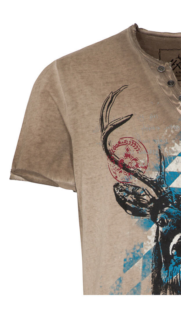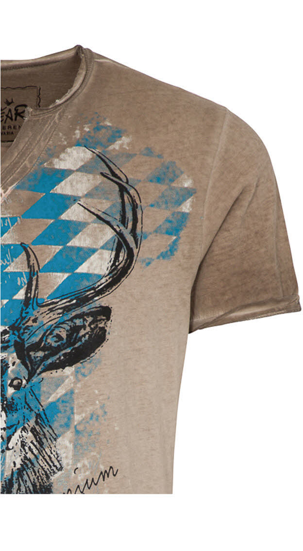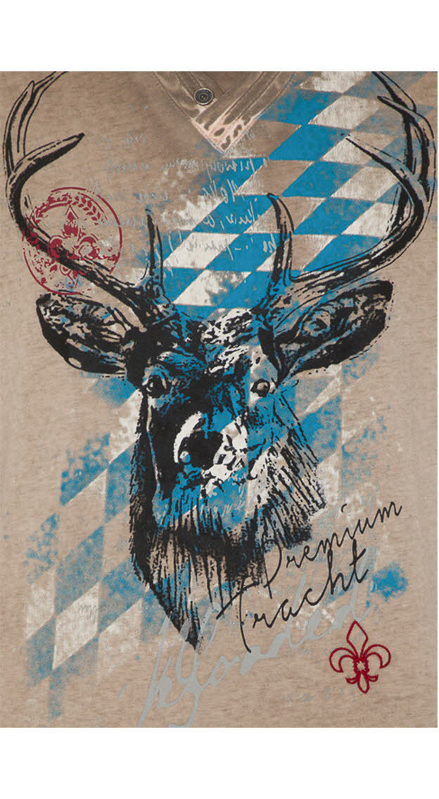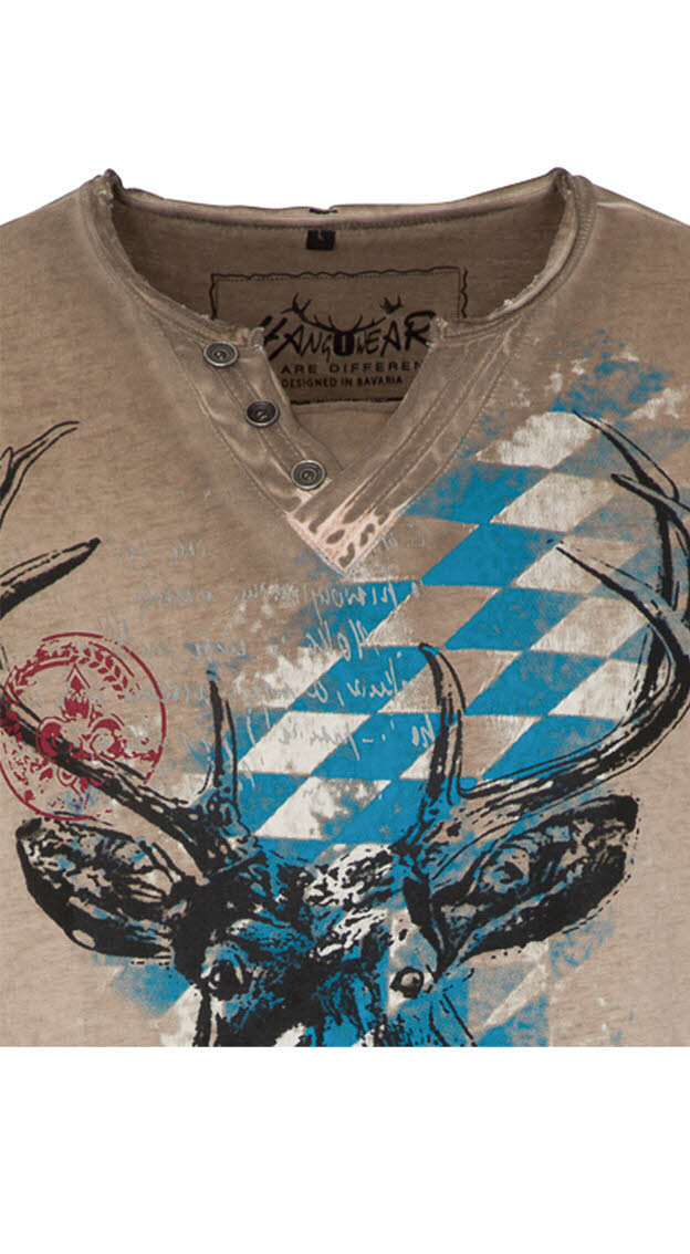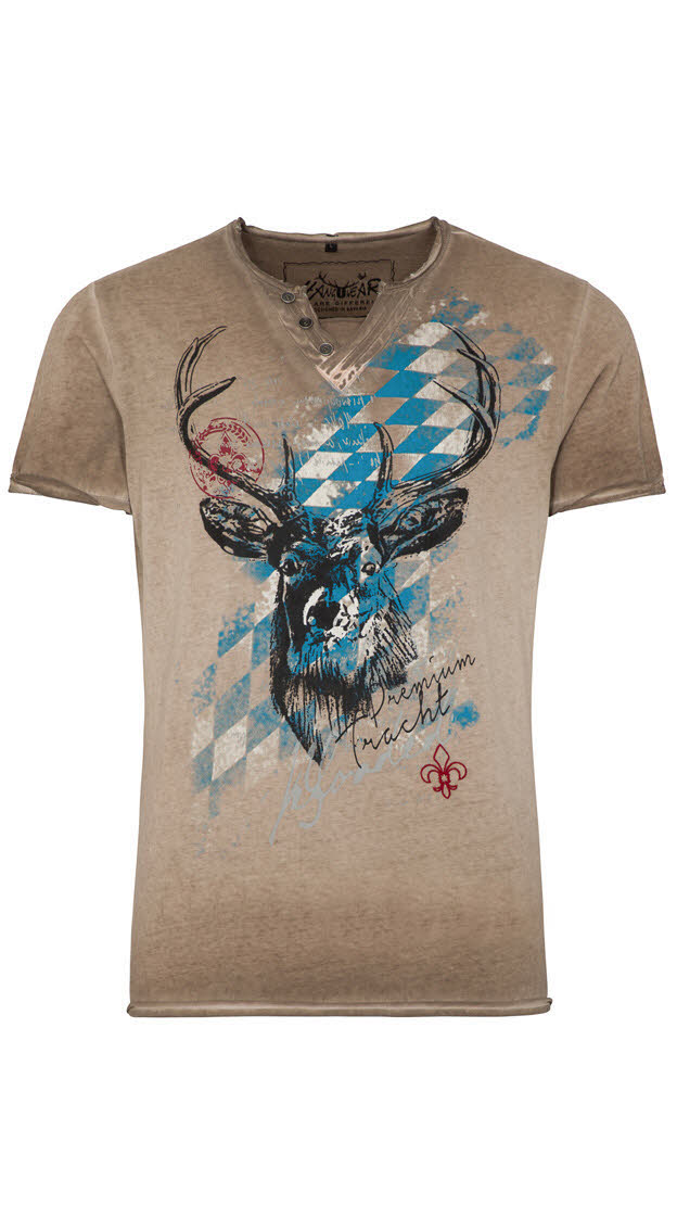 Ein junges lässiges Trachtenshirt Fritz in Braun von HangOwear, das mit seinem Gesamteindruck besticht. Es ist im angesagten Used-Look gehalten. Vorne ziert ein Hirschkopf und die Bayern-Rauten das Trachten-Shirt. Auch der SchriftzugâÜ Premium TrachtâÜ ist mit abgedruckt. Zusätzlich sind verschiedene Muster in Rot eingewebt und aufgedruckt. Das Markenlogo HangOwear ist unten links am Rücken. Möchten Sie für Beifall sorgen, dann heben Sie das Shirt doch vorne einfach mal an! Ein größerer Schriftzug mit dem Spruch âBierwampeâÜ ist dann zu sehen. Sie sind damit garantiert der Hit auf jeder Kirchweih oder auch auf jeder Feierlichkeit.
