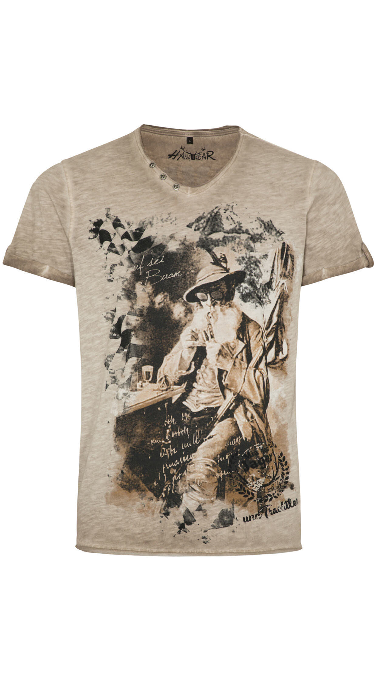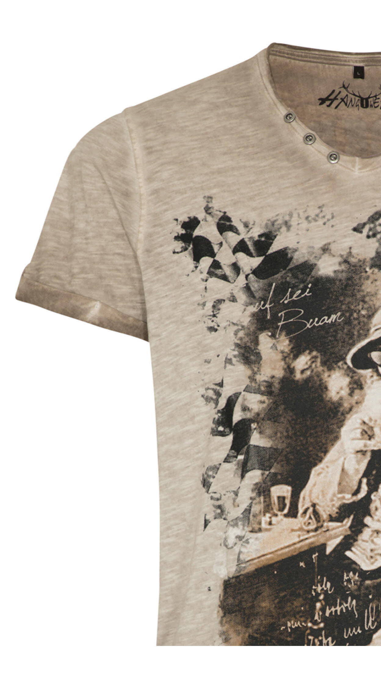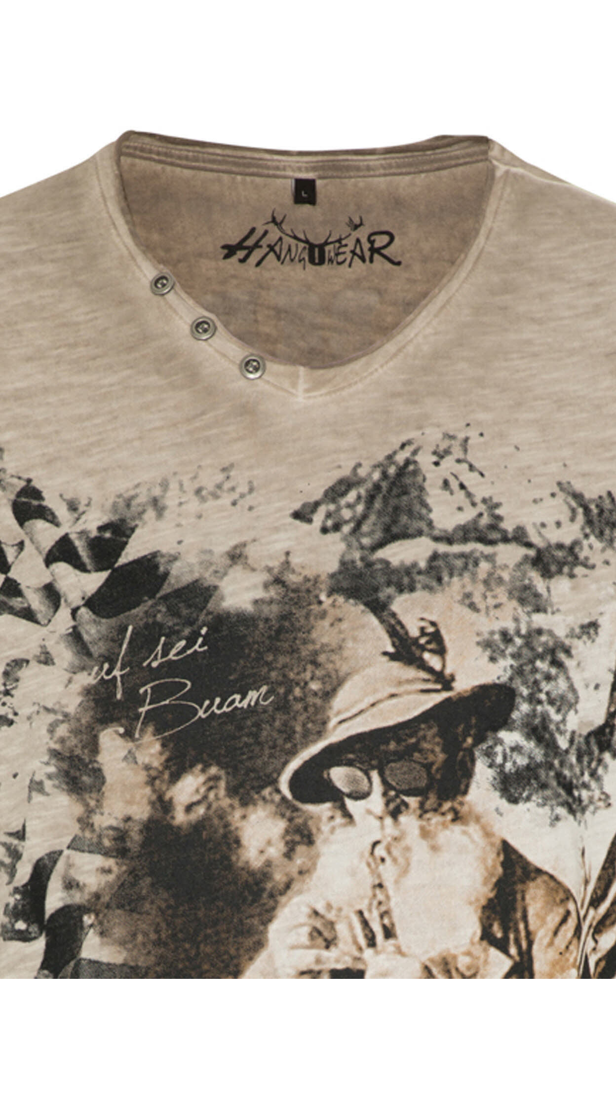 Ein junges lässiges Trachtenshirt Theo in Beige von hangOwear, das mit dem Gesamteindruck besticht. Das coole Kurzarm Shirt aus reiner Baumwolle in Melange-Optikist mit angesagten offenen Kanten am Ausschnitt und am Saum. Den schicken V-Ausschnitt zieren drei altsilberne Metallknöpfe an der rechten Seite. Vorne ziert ein Urbayer-Hippster mit Sonnenbrille und Pfeife stopfend das Trachten-Shirt. Verziert ist mit handgeschriebenem Text und Schrift. Der Schriftzug unten links  Mia san Jager und Trachtler, ist mit Geweih, gekreuzten Pfeilen und Ähren. Innen an der der Vorderseite des Trachtenshirts ist ein cooler Print  Cool Man angebracht. Die Rückseite des T-Shirts ist mit dem Schriftzug Wuid. Dem Markenlogo, est 2014, sowie Club verziert. Sie sind damit garantiert der Hit auf jeder Kirchweih oder auch auf jeder Feierlichkeit.