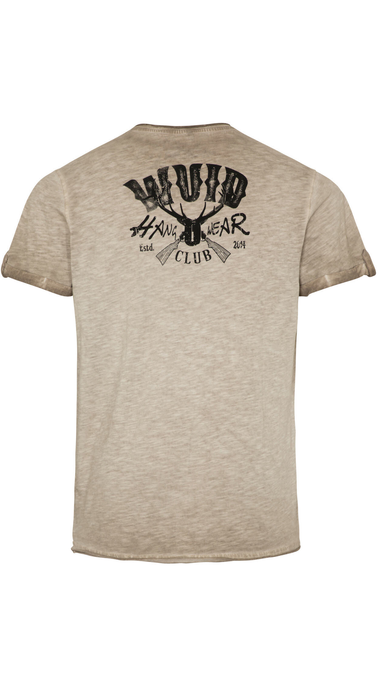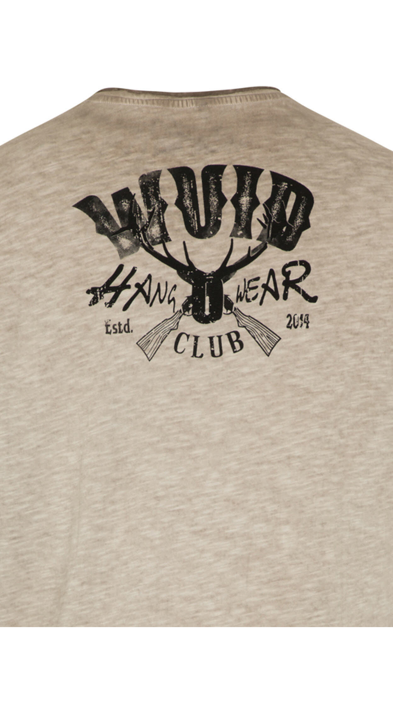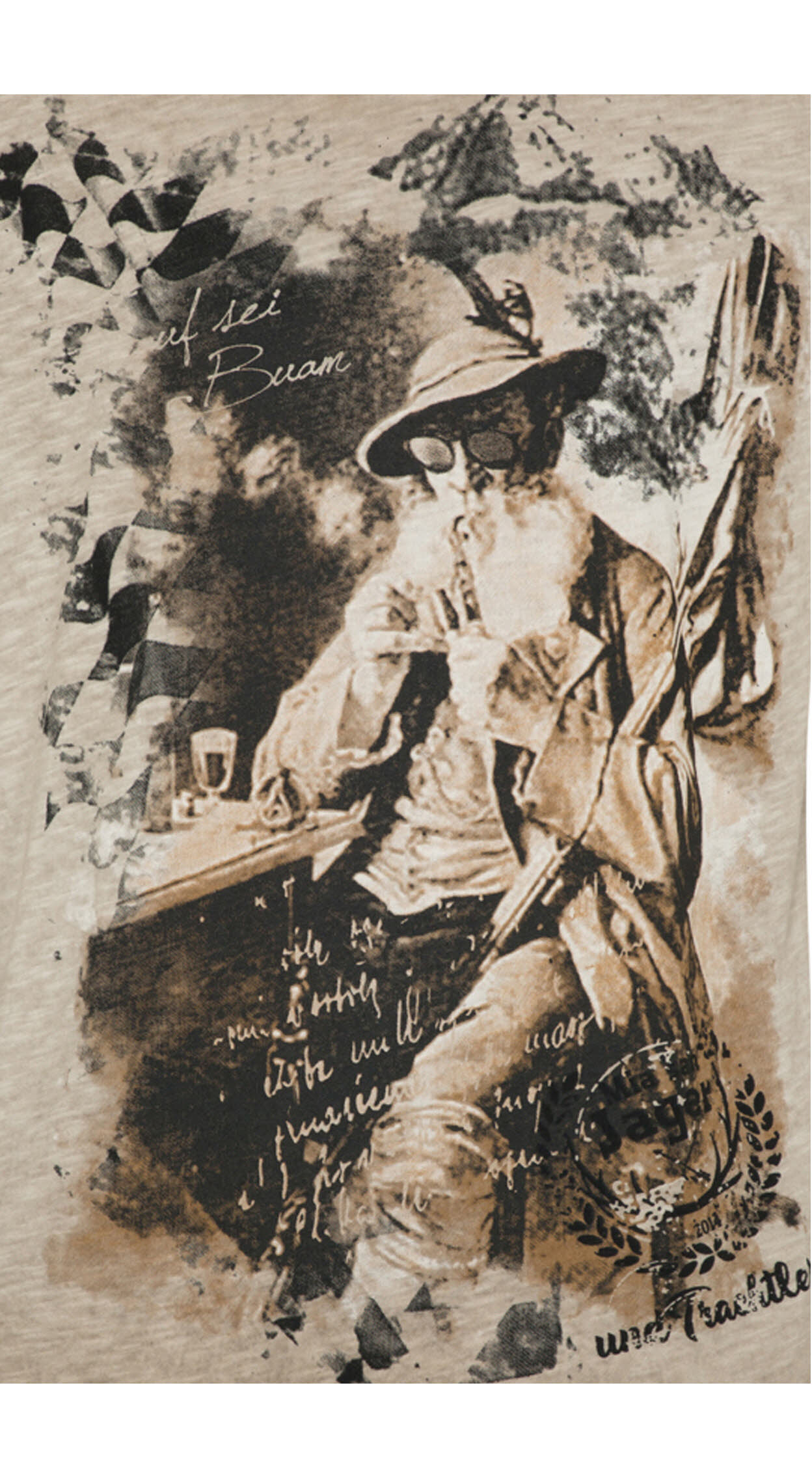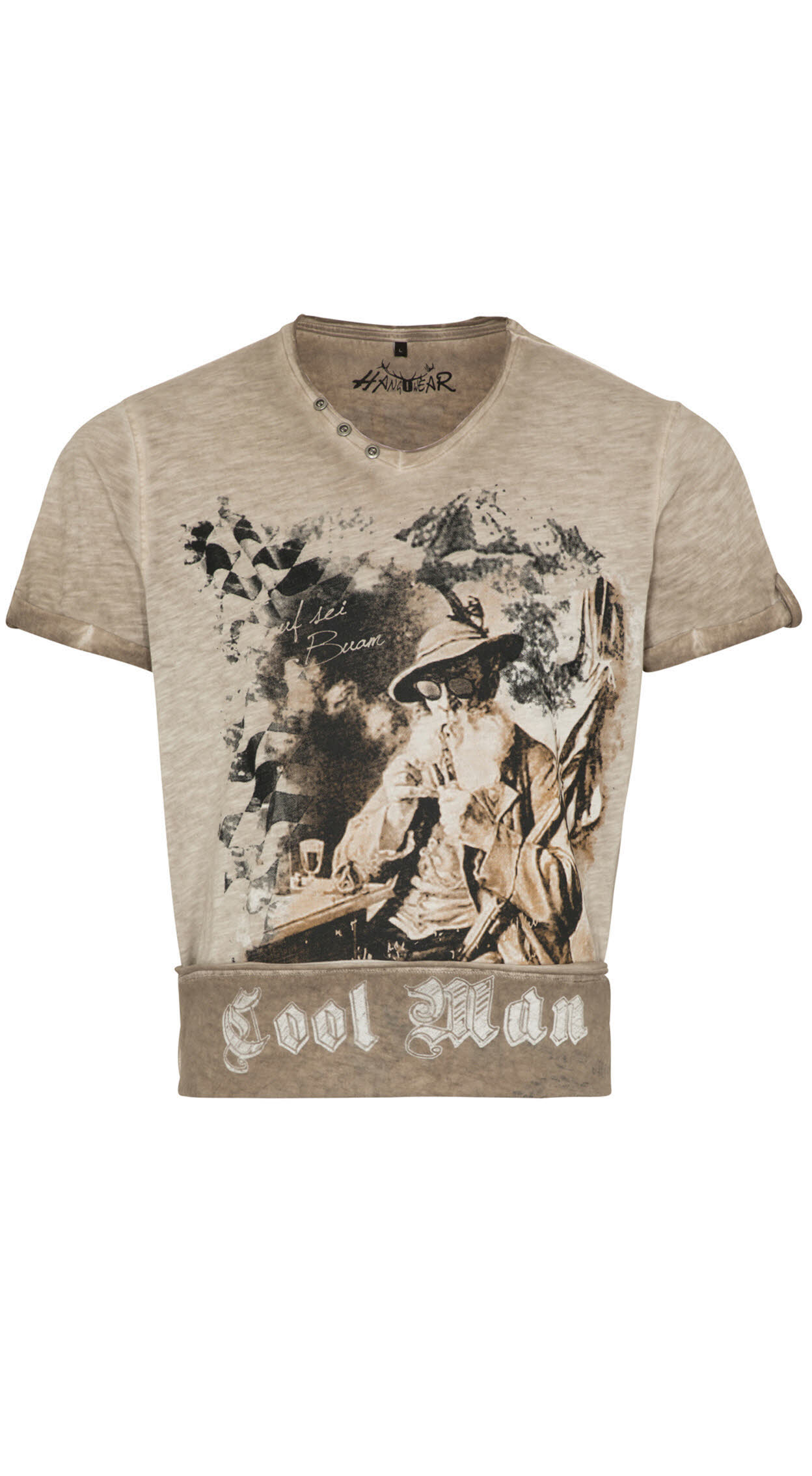 Ein junges lässiges Trachtenshirt Theo in Beige von hangOwear, das mit dem Gesamteindruck besticht. Das coole Kurzarm Shirt aus reiner Baumwolle in Melange-Optikist mit angesagten offenen Kanten am Ausschnitt und am Saum. Den schicken V-Ausschnitt zieren drei altsilberne Metallknöpfe an der rechten Seite. Vorne ziert ein Urbayer-Hippster mit Sonnenbrille und Pfeife stopfend das Trachten-Shirt. Verziert ist mit handgeschriebenem Text und Schrift. Der Schriftzug unten links  Mia san Jager und Trachtler, ist mit Geweih, gekreuzten Pfeilen und Ähren. Innen an der der Vorderseite des Trachtenshirts ist ein cooler Print  Cool Man angebracht. Die Rückseite des T-Shirts ist mit dem Schriftzug Wuid. Dem Markenlogo, est 2014, sowie Club verziert. Sie sind damit garantiert der Hit auf jeder Kirchweih oder auch auf jeder Feierlichkeit.