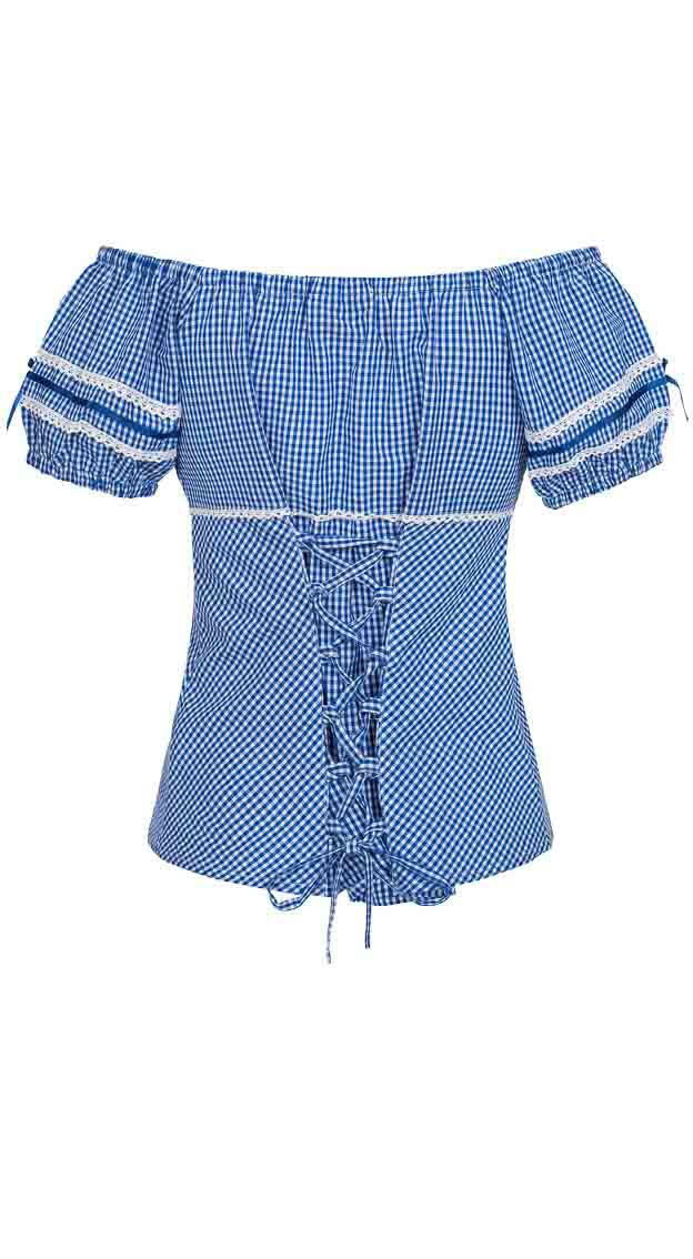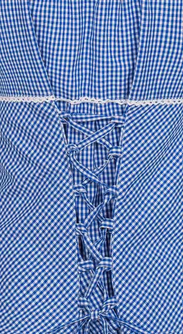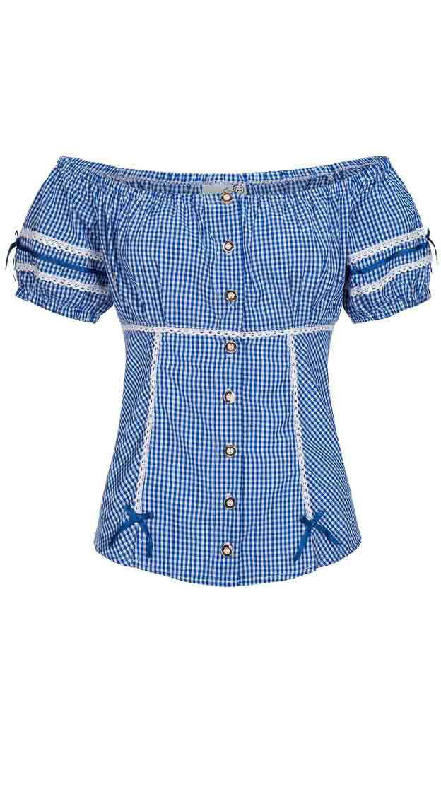 Die karierte Trachtenbluse von Marjo präsentiert sich im trendigen Carmen-Stil. Sie ist in einem schönen blau-weißen Karomuster gehalten. Geschlossen wird die Carmenbluse mit acht Knöpfen in Hirschhorn-Optik. Unter der Brust und an den Seiten befinden sich Teilungsnähte, die eine schöne Figur zaubern. Geschmückt ist die Trachtenbluse Grete an den Ärmeln mit zwei weißen Spitzenborten und einem blauen Satinband. Ein Highlight dieser Carmenbluse sind die zwei blauen Satinschleifen auf den Teilungsnähten. Ein weiterer Hingucker ist die Rückseite der Carmenbluse Grete. Diese ist mit einem Band in derselben Farbe wie die Bluse geschnürt. Diese Trachtenbluse passt sowohl zur Lederhose als auch zu jeder anderen Hose. Sie kann im Alltag als auch auf jeder Kirchweih, Volksfesten und Familienfeiern getragen werden.
