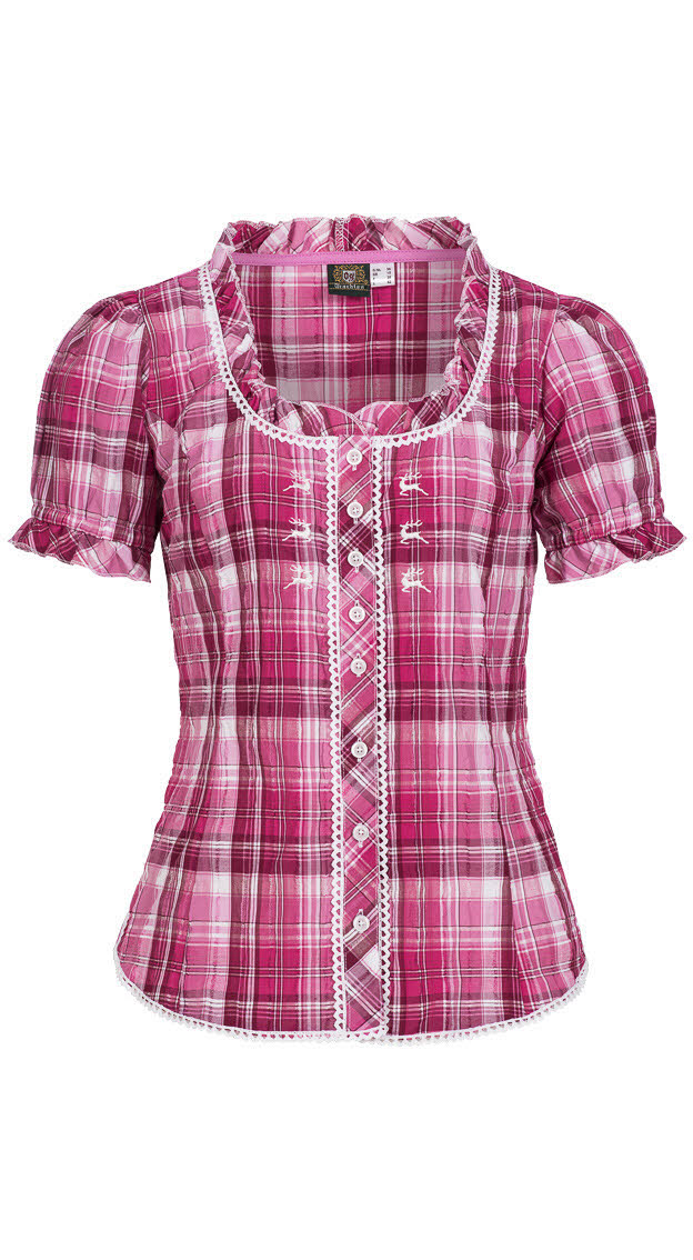 Die Stretch-Trachtenbluse in Karomuster Magda ist eine klassische Trachtenbluse in der Farbkombination Beere und Weiß. Eine weiße Spitzenborte ziert den Rüschenkragen, beide Seiten der Knopfleiste und den Abschluß der Bluse. Links und rechts der Knopfleiste befinden sich jeweils 3 Hirschstickereien in Weiß. Verschlossen wird die Miederbluse mit passenden Knöpfen in Perlmutt-Optik.Die Stretch-Funktion der Bluse und der Ärmel garantieren einen hohen Tragekomfort. Diese Miederbluse passt sowohl zur Lederhose als auch zu jeder anderen Hose. Sie kann im Alltag als auch auf jeder Hochzeit, Kommunion, Taufe, Firmung, Konfirmation und Familienfeier  getragen werden.