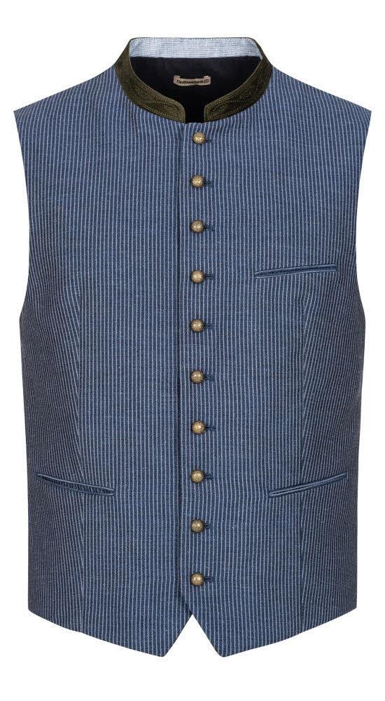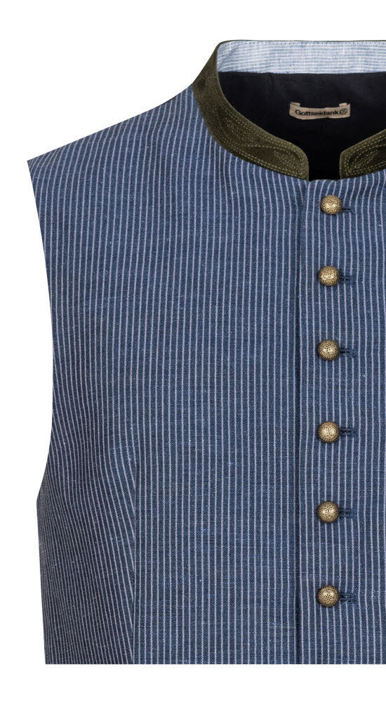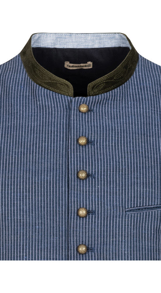 Ein echtes Trachten-Schmanker'l ist das Gilet Ärmellos Christian in Dunkelblau von Gottseidank. Das Gilet hat einen grün-schimmernden Stehkragen, der dezent bestickt ist. Das dunkelblaue Vorderteil ist in einem Muster mit hellblauen Streifen gehlalten. Auffallend sind die filigranen Knöpfe zum verschließen. Eine Brusttasche und zwei Eingriffstaschen sind ebenfalls vorhanden. Der Westenrücken ist aus einem  schwarzen Stoff. Er ist allover mit einem kleinen Rautenmuster versehen. In der Mitte unten befondet sich ein kleiner V-Schlitz. Der verstellbare Rückenriegel mit seiner Schnalle sorgt für einen perfekten Sitz. Durch das angenehme Innenfutter garantiert es einen tollen Tragekomfort.