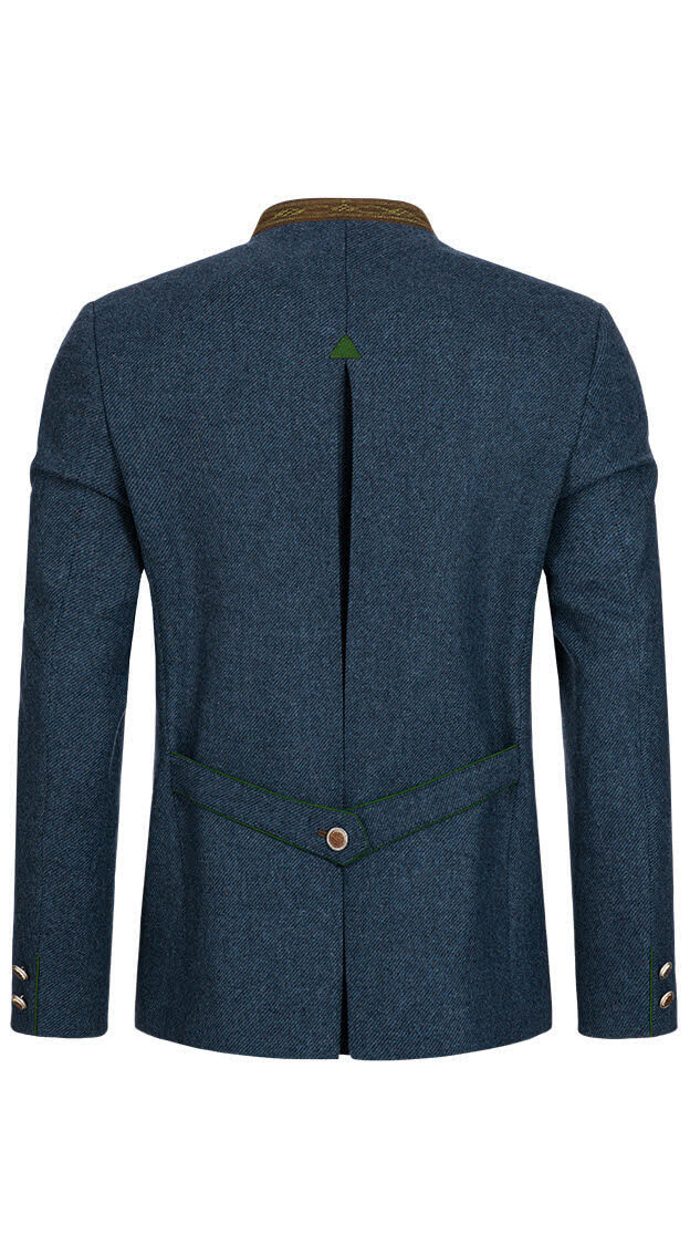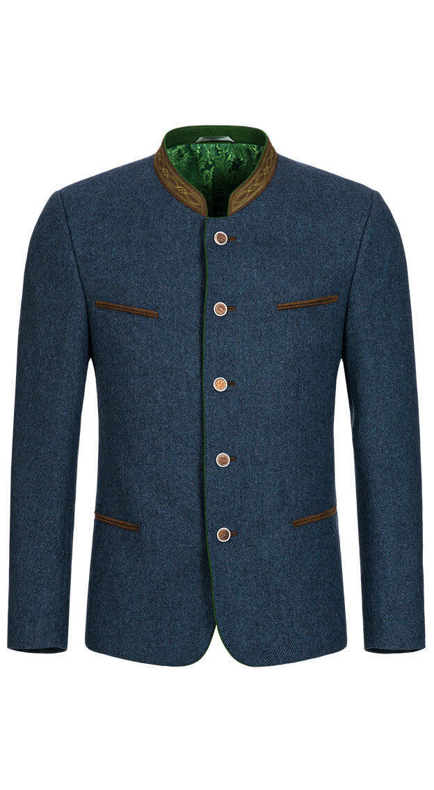 Der zeitlose Trachtenjanker Peter aus dem Hause Kaiseralm in Blau besitzt einen braunen Stehkragen, auf der sich eine schöne Stickerei befindet. Vorne sind drei braune Paspeltaschen angebracht. Die Ärmel sind mit zwei Knöpfen verziert. Das Rückteil ist mit einer Falte und einem Rückenriegel, auch Dragoner genannt, geschmückt. Verschlossen wird der Peter mit Knöpfen aus Hirschhornoptik mit Metallverzierung. Ein glattes Innenfutter trägt zu einem hohen Tragenkomfort bei. Der Trachtenjanker Peter passt perfekt zur Lederhose als auch zu jeder anderen Hose. Er kann im Alltag als auch auf Festlichkeiten wie Hochzeiten, Taufe, Kommunion, Konfirmation, Firmung und Familienfeiern getragen werden.