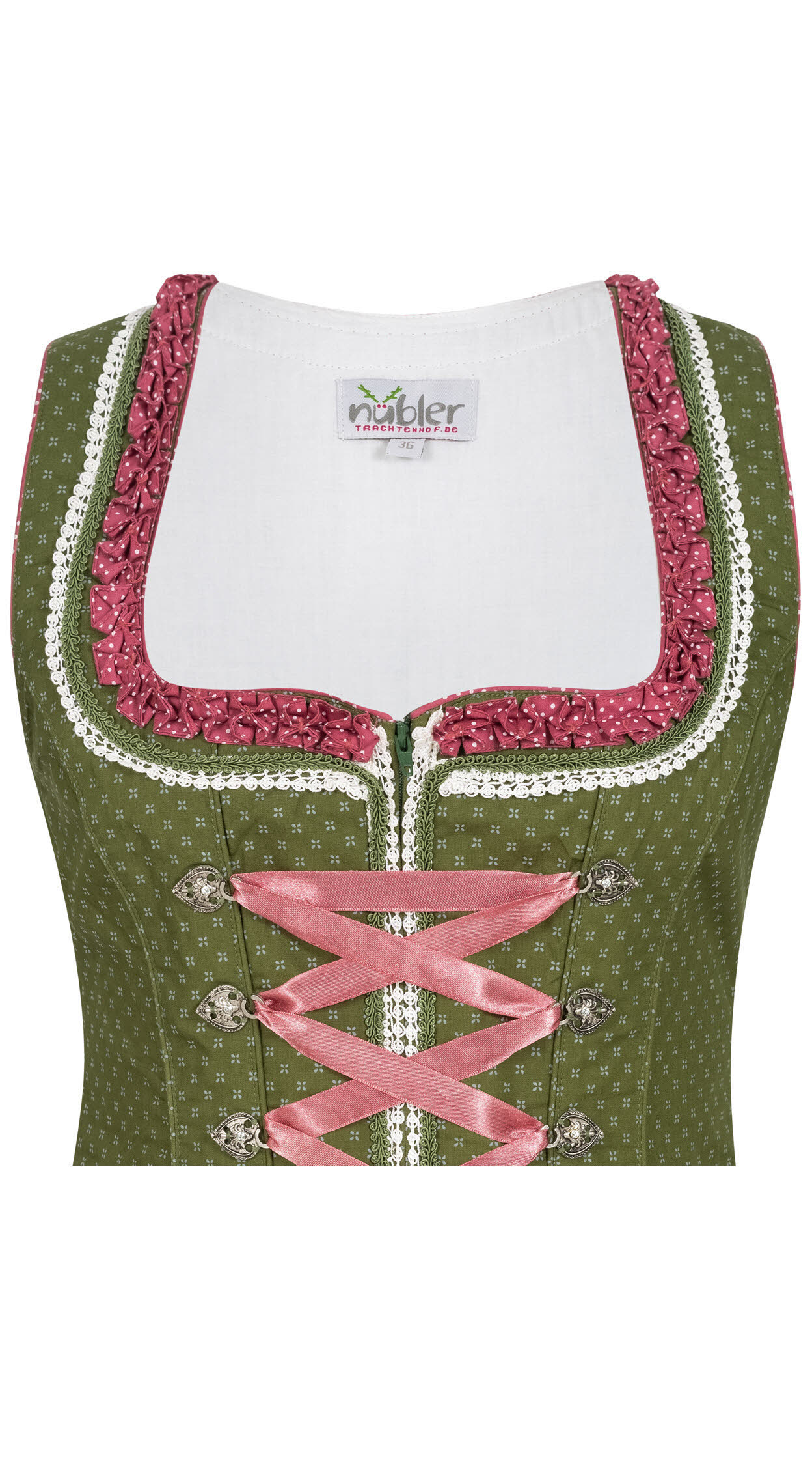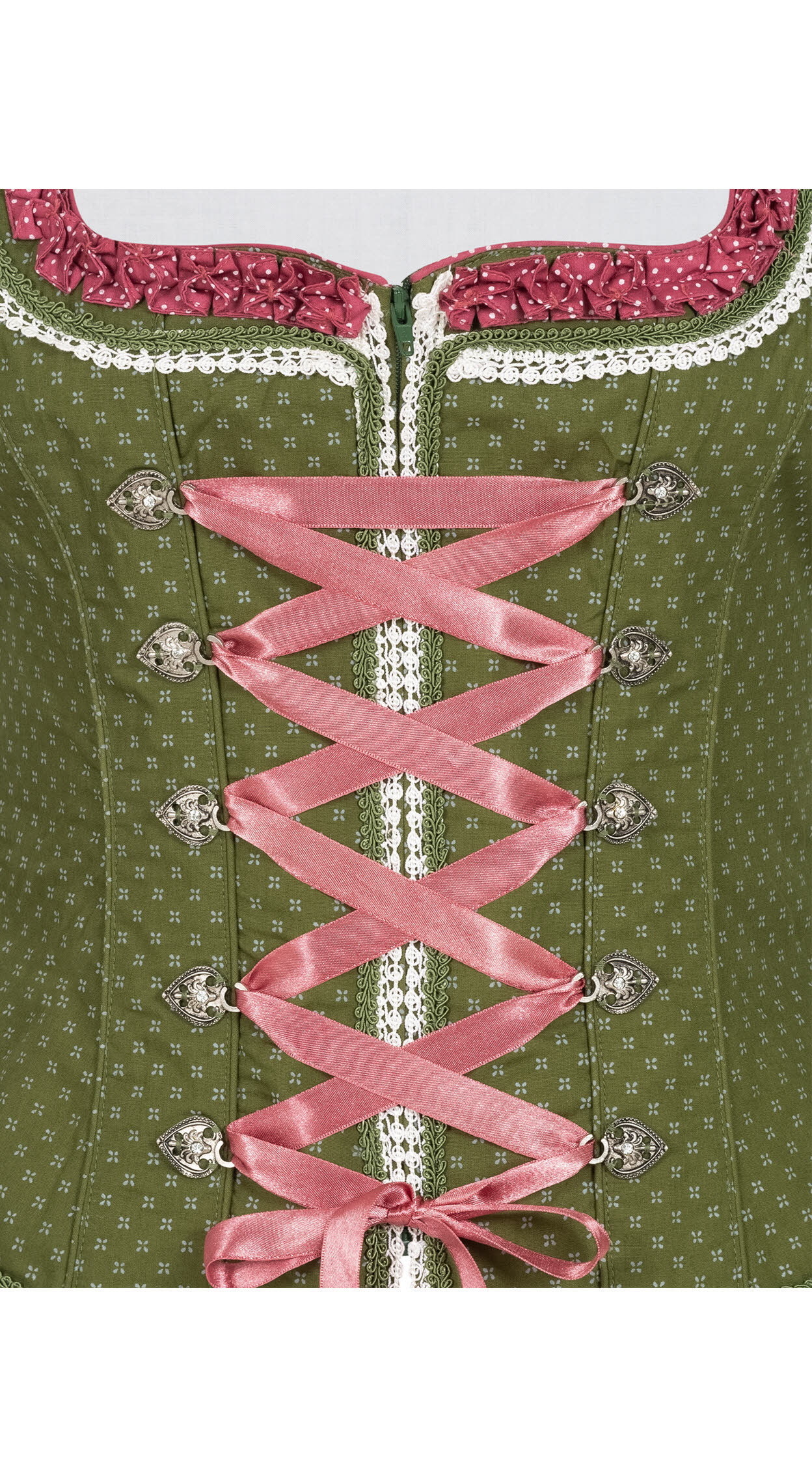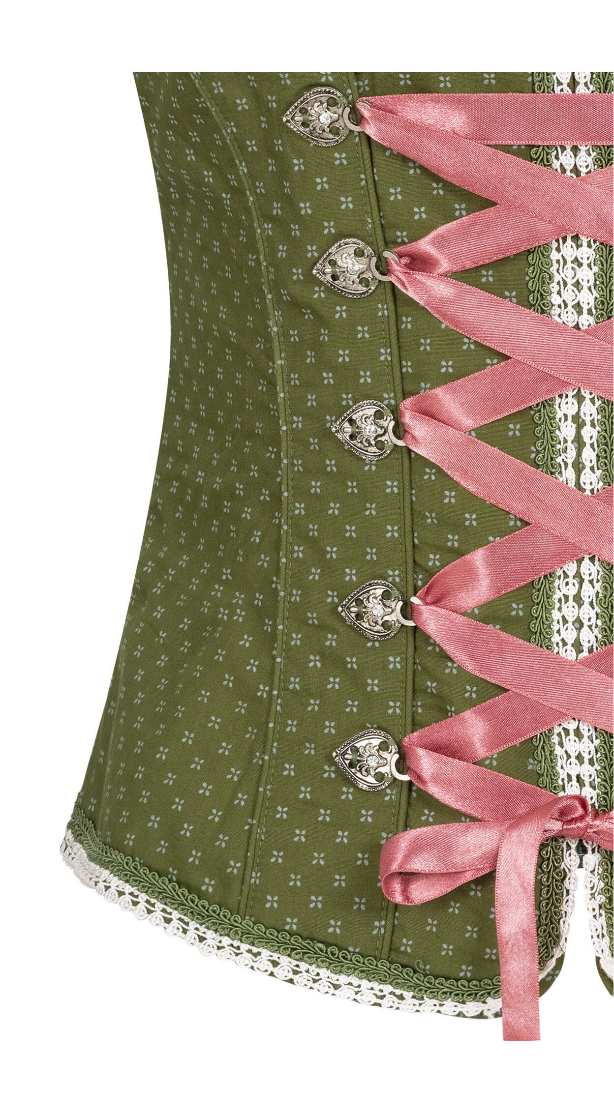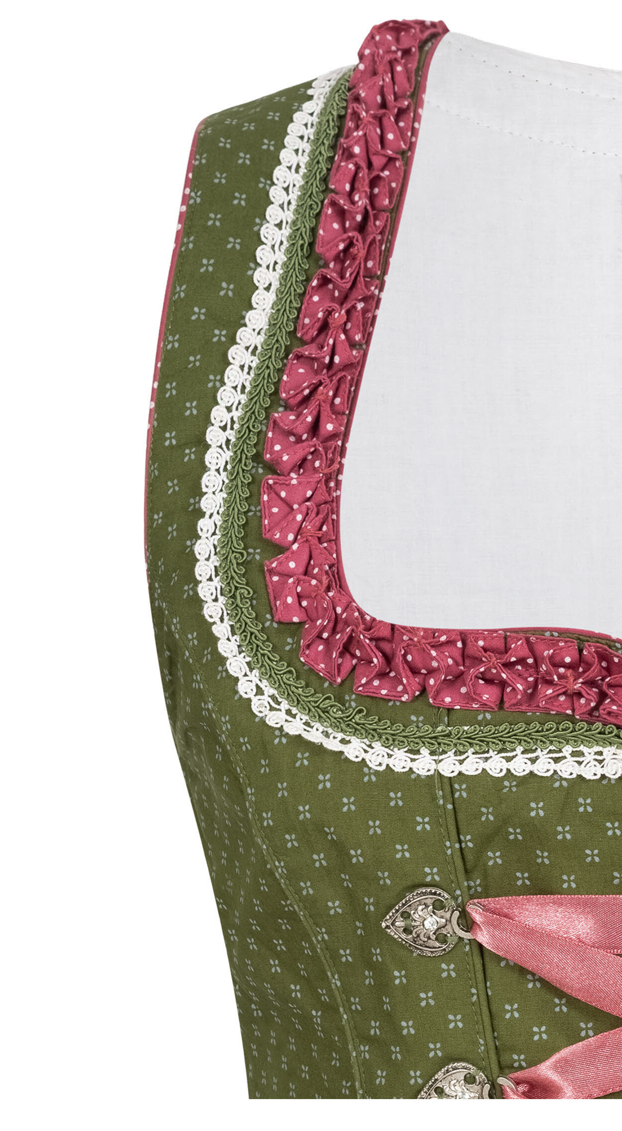Das Trachtenmieder Martina in Grün von Nübler ist ein traditionelles Mieder, welches besonders gut zur Jeans und zu jedem Trachtenoutfit getragen werden kann. Es ist in Grün gehalten und wird geschmückt von einem feinen Blumendruck in Weiß. Ins Auge stechen einem sofort die schönen Miederhaken in Silberoptik, die die Form eines Herzens haben und mit einem Strassstein geschmückt sind. Ein weiterer Hingucker ist die um den Ausschnitt angebrachte Froschgoscherlborte in einem tollen Rosafarbenen Stoff mit weißen Pünktchen. Die Farbe dieser Borte ist auch an den Armausschnitt damit abgepaspelt. Auffallend sind auch die Posamenten- und Häkelborten die den Ausschnitt und den gesamten Bund, sowie entlang des Reißverschlusses, das Mieder zieren.