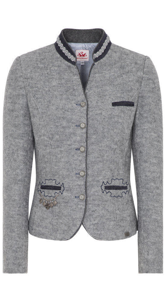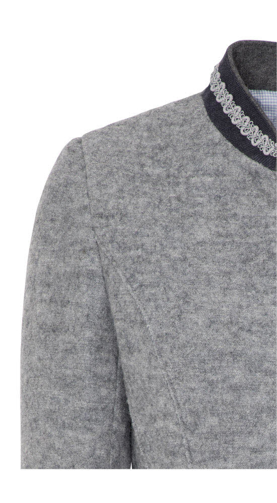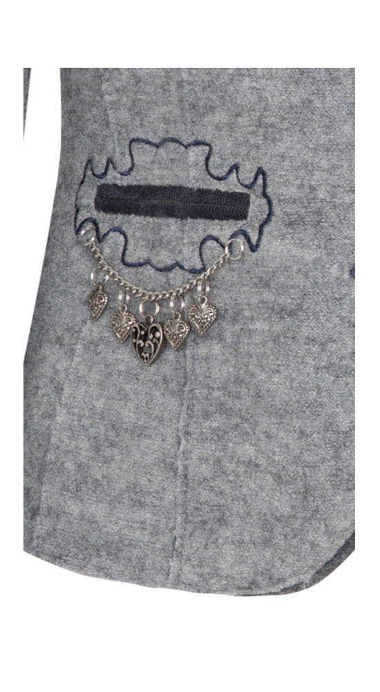 Die schicke Trachtenjacke ist perfekt für schicke Anlässe. Durch ihren hohen Baumwollanteil ist sie sehr angenehm und leger zu tragen. Sie ist tailliert geschnitten und wird mit altsilbernen Knöpfen verschlossen. Der edle Kragen ist in einem Dunkelgrau abgesetzt und mit einer Spitzenbordüre besetzt. Entlang der Knopfleiste und dem leichten V-Ausschnitt ist sie dunkel paspeliert. Vorne befinden sich drei Eingriffstaschen. Alle drei sind Dunkelgrau abgesteppt. Die unteren beiden Taschen sind mit einer Stickerei versehen. Ein kleines Charivari wurde an der rechten Eingriffstasche angebracht.